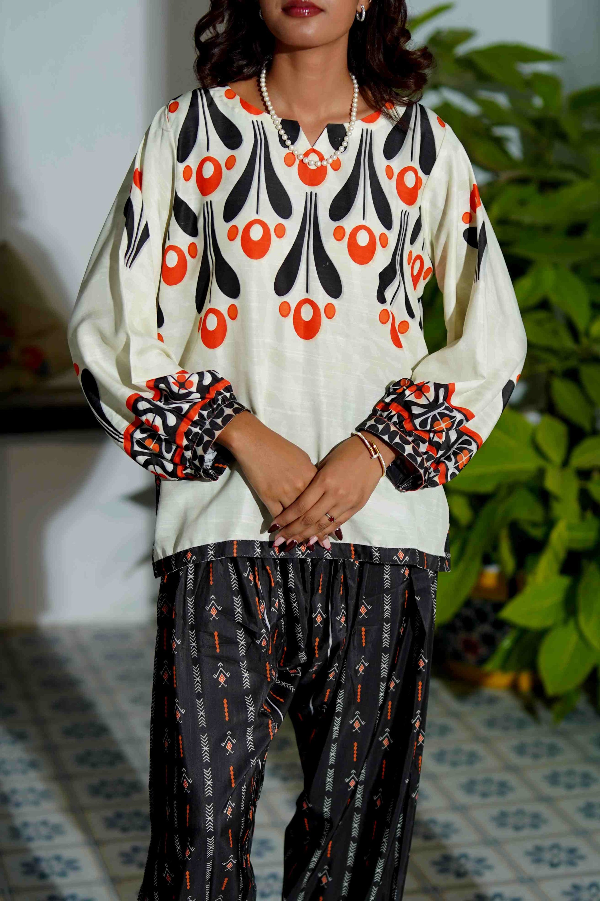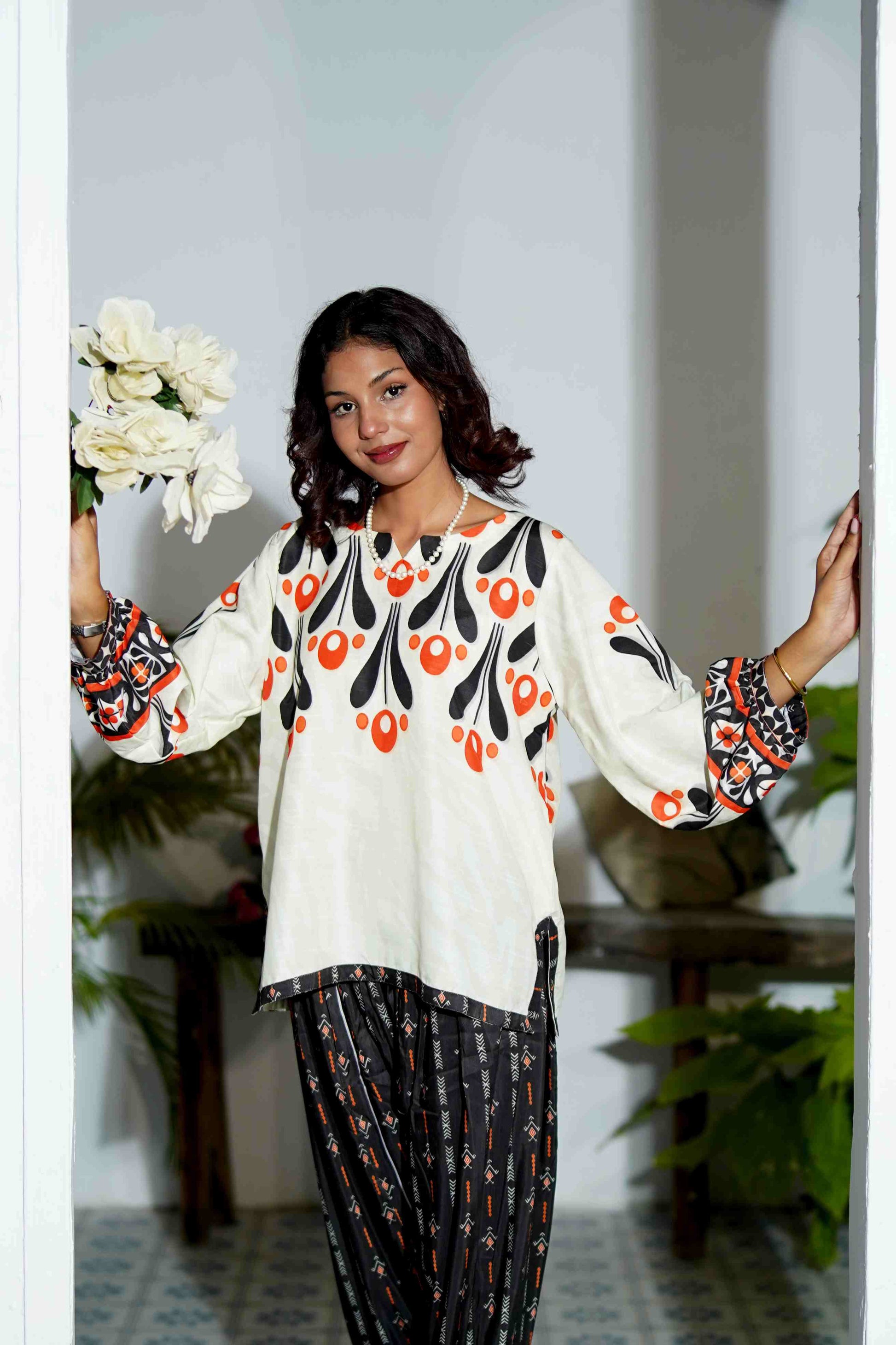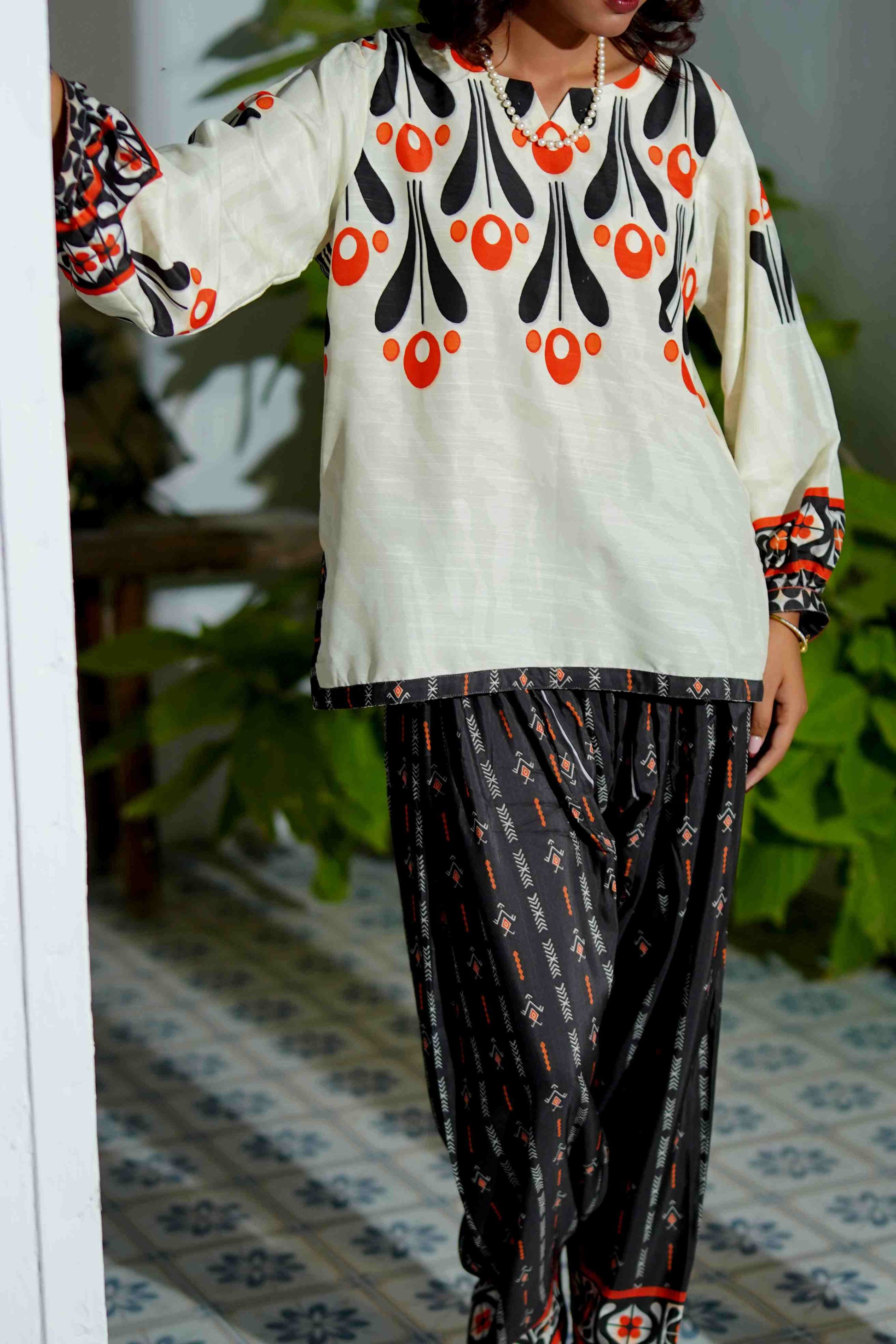 Add effortless charm to your wardrobe with this printed co-ord set crafted from soft pure Slub. Featuring a geometric pattern , the set pairs a shirt with contrast Shalwar. Perfect for casual outings, brunches, or everyday wear.
