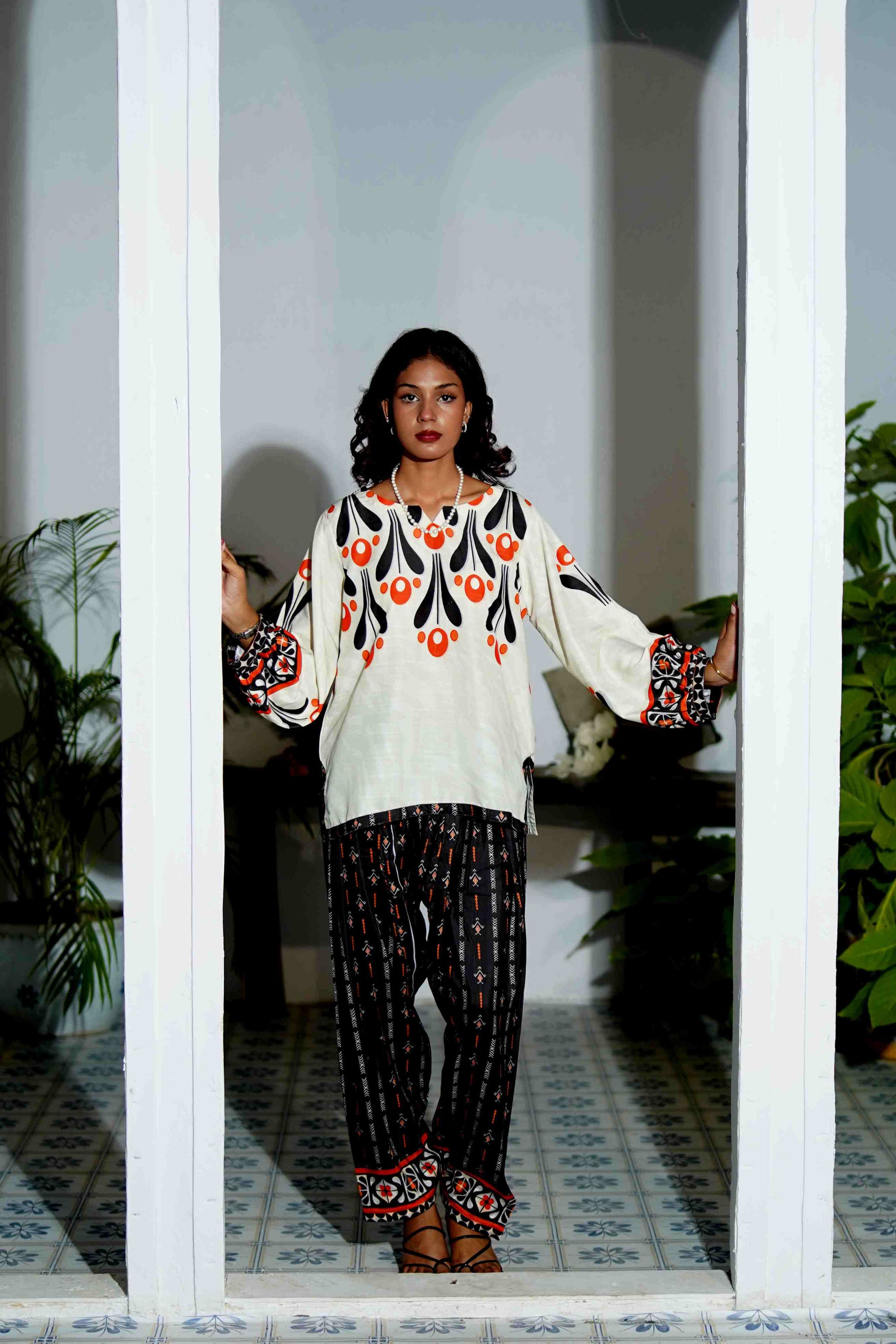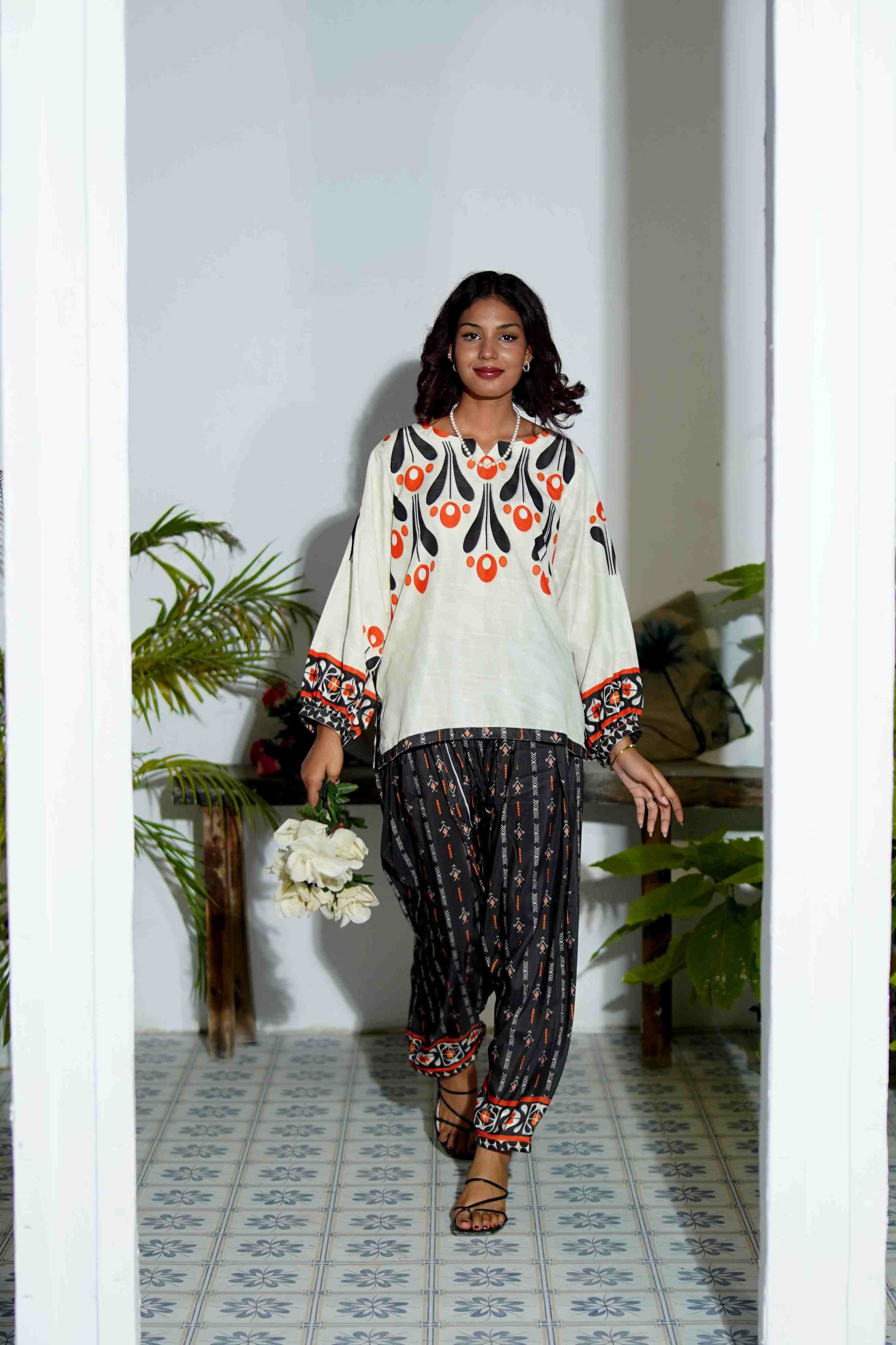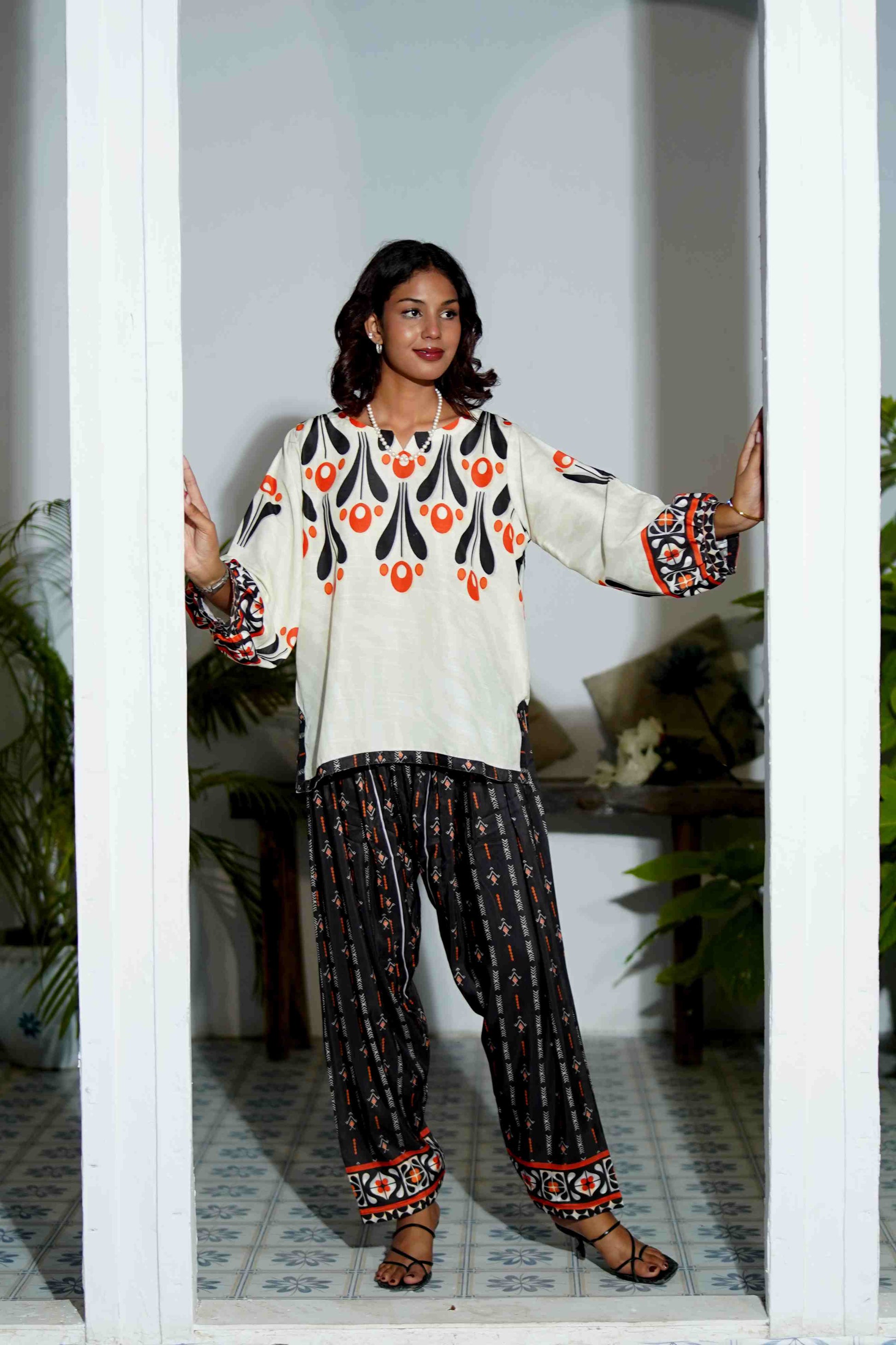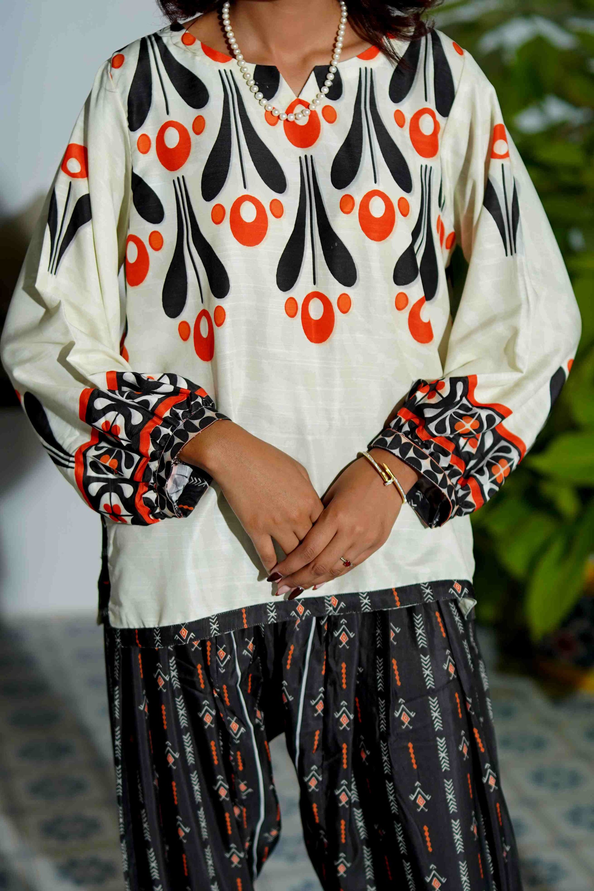 Add effortless charm to your wardrobe with this printed co-ord set crafted from soft pure Slub. Featuring a geometric pattern , the set pairs a shirt with contrast Shalwar. Perfect for casual outings, brunches, or everyday wear.