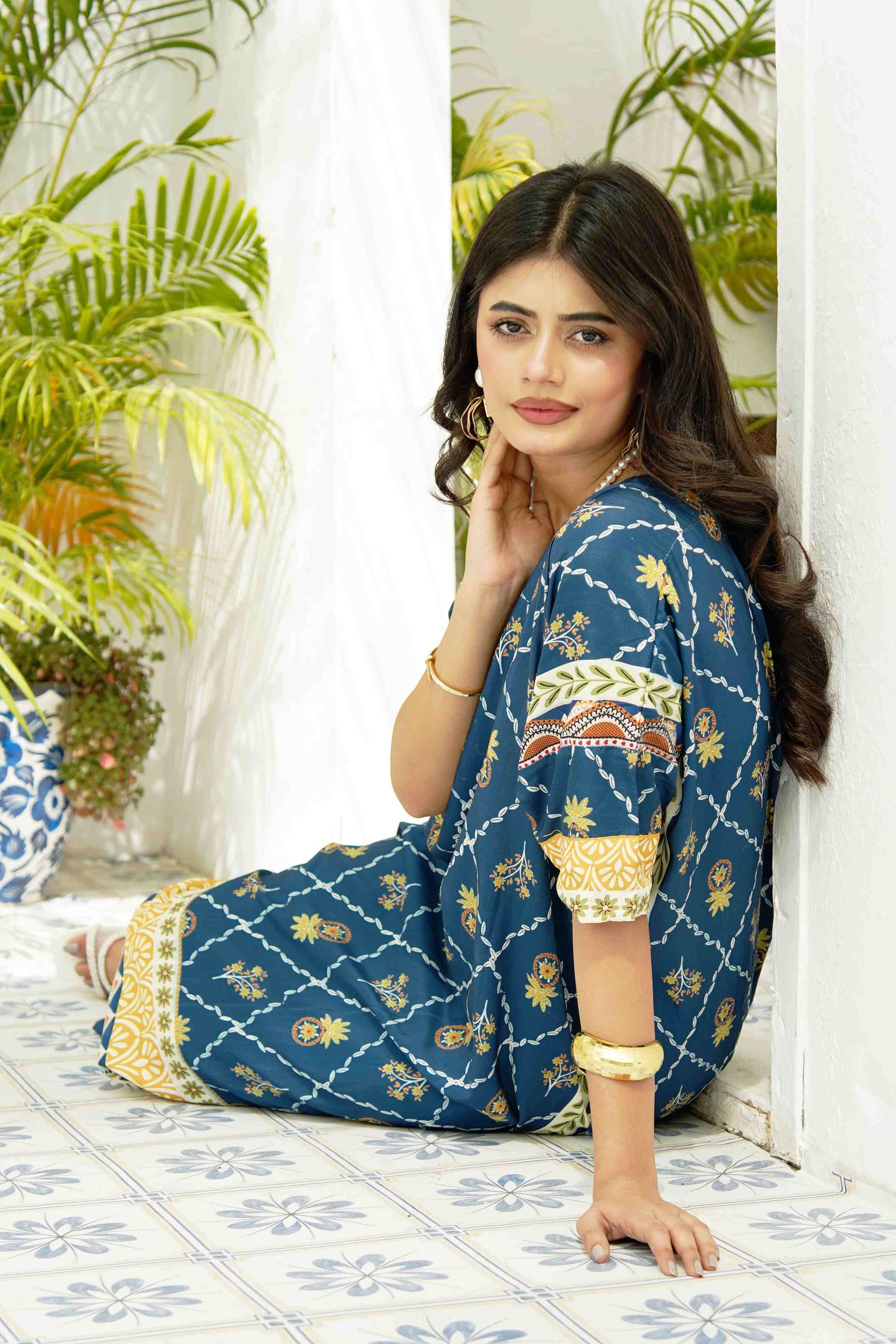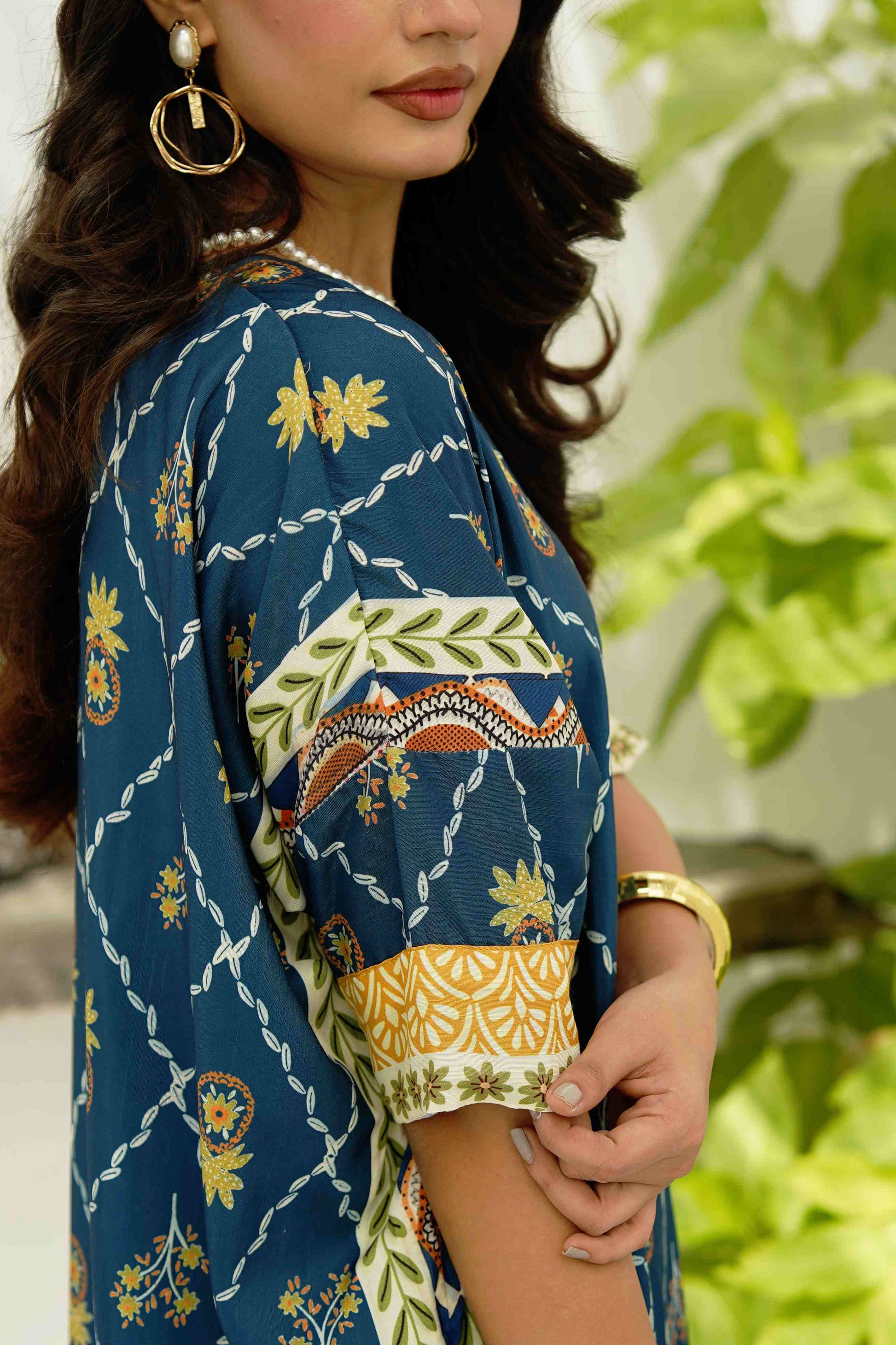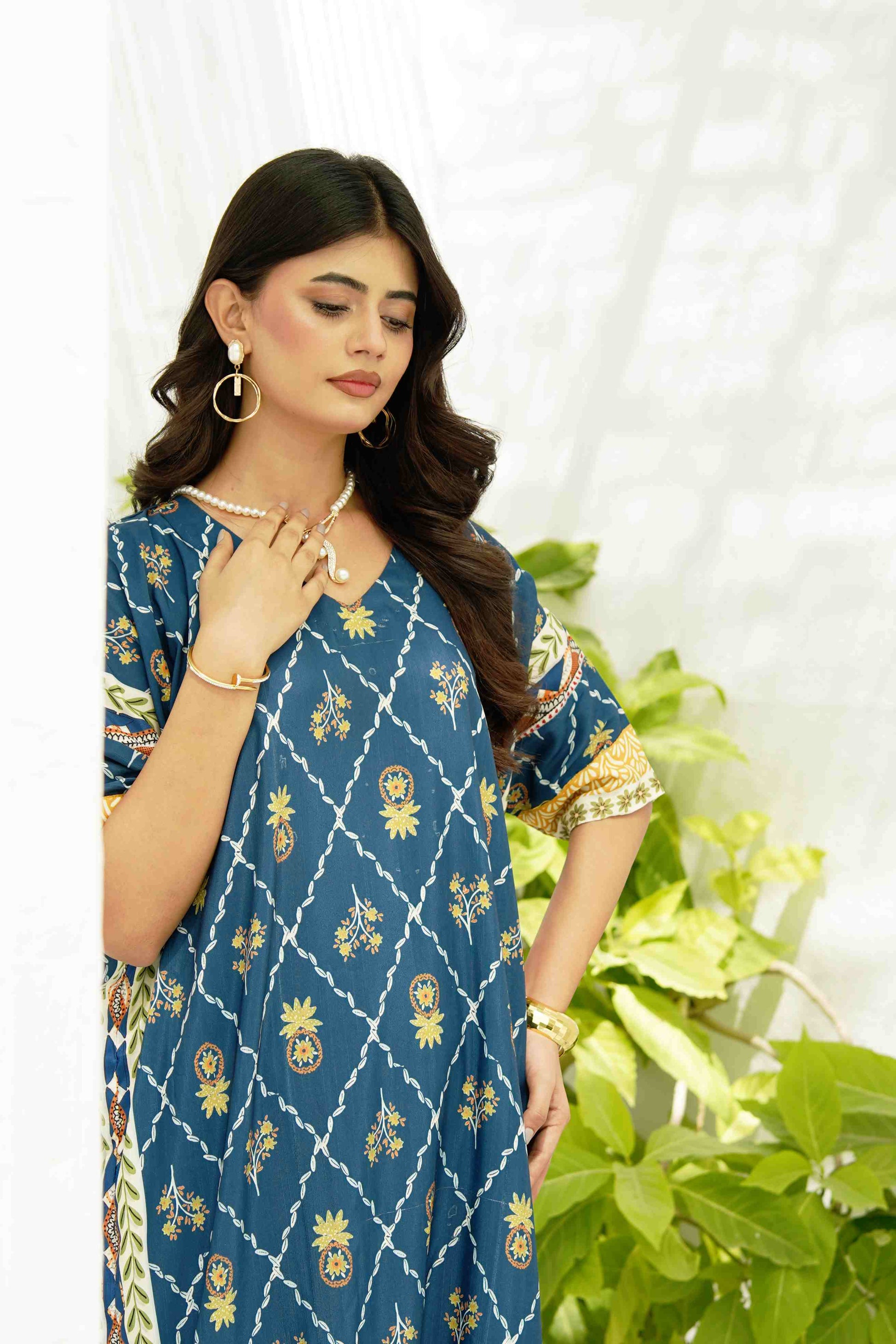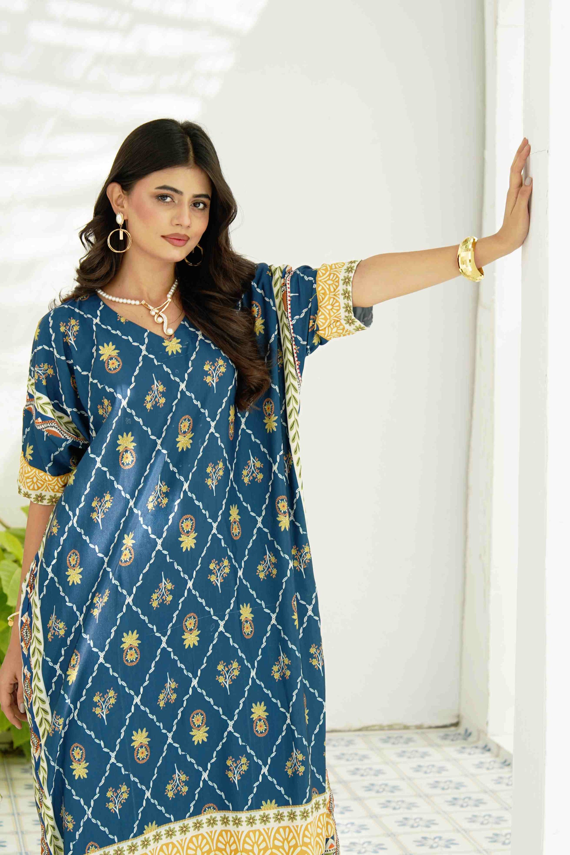 A statement in effortless luxury — this beautifully draped kaftan is crafted from Slub in a rich Navy blue tone. Embellished with detailing along the neckline, it combines fluid elegance with refined craftsmanship. Perfect for festive evenings, intimate dinners, or wedding soirées.