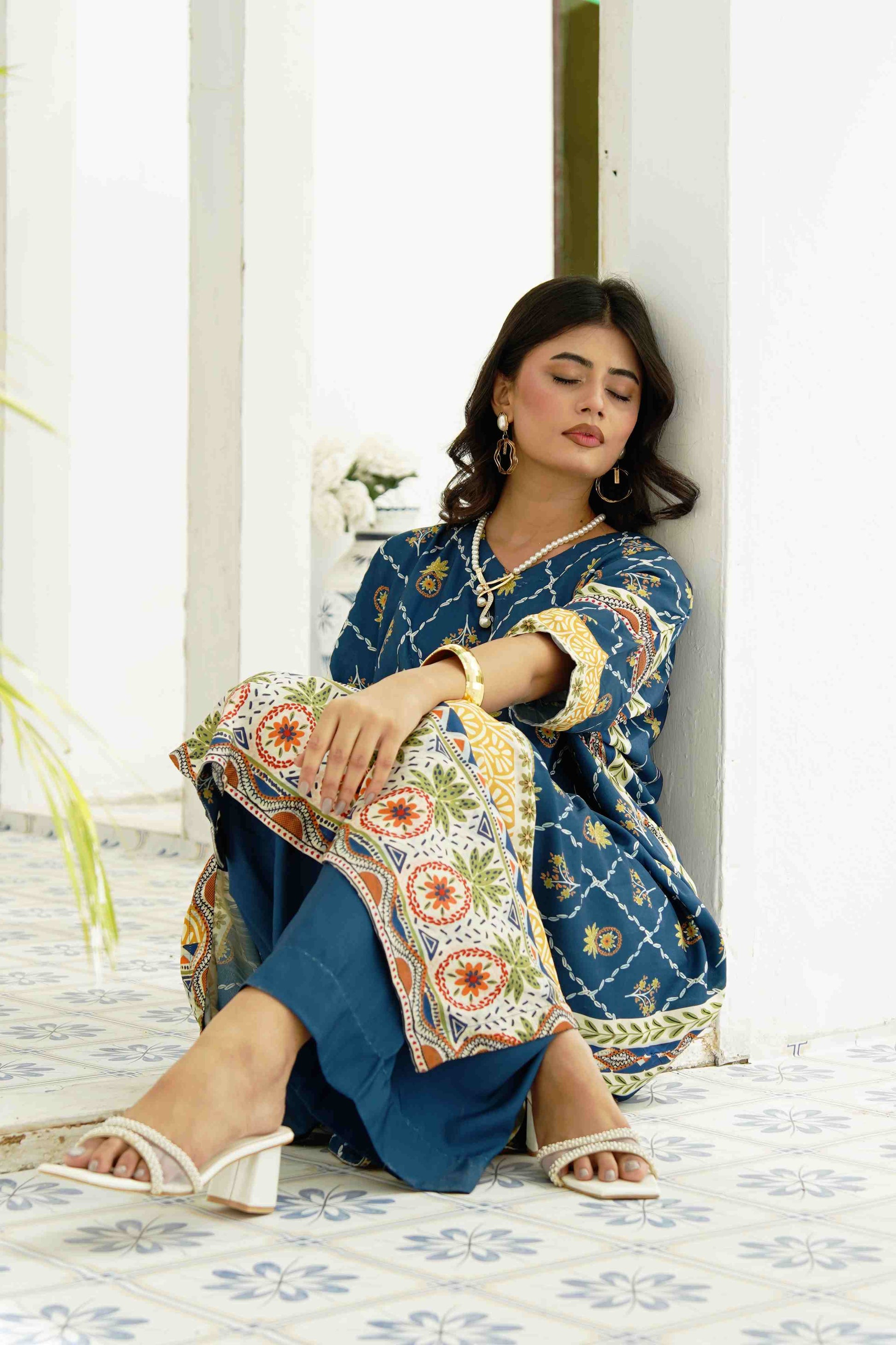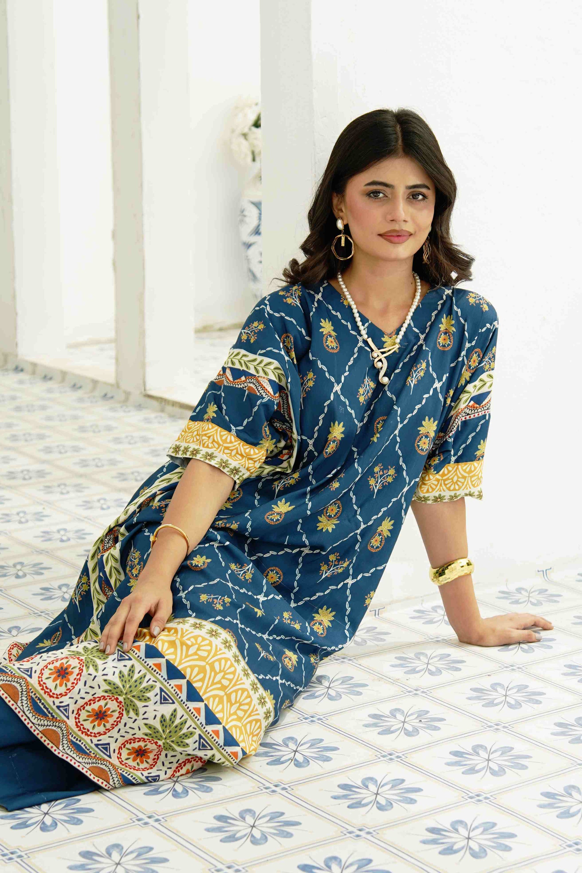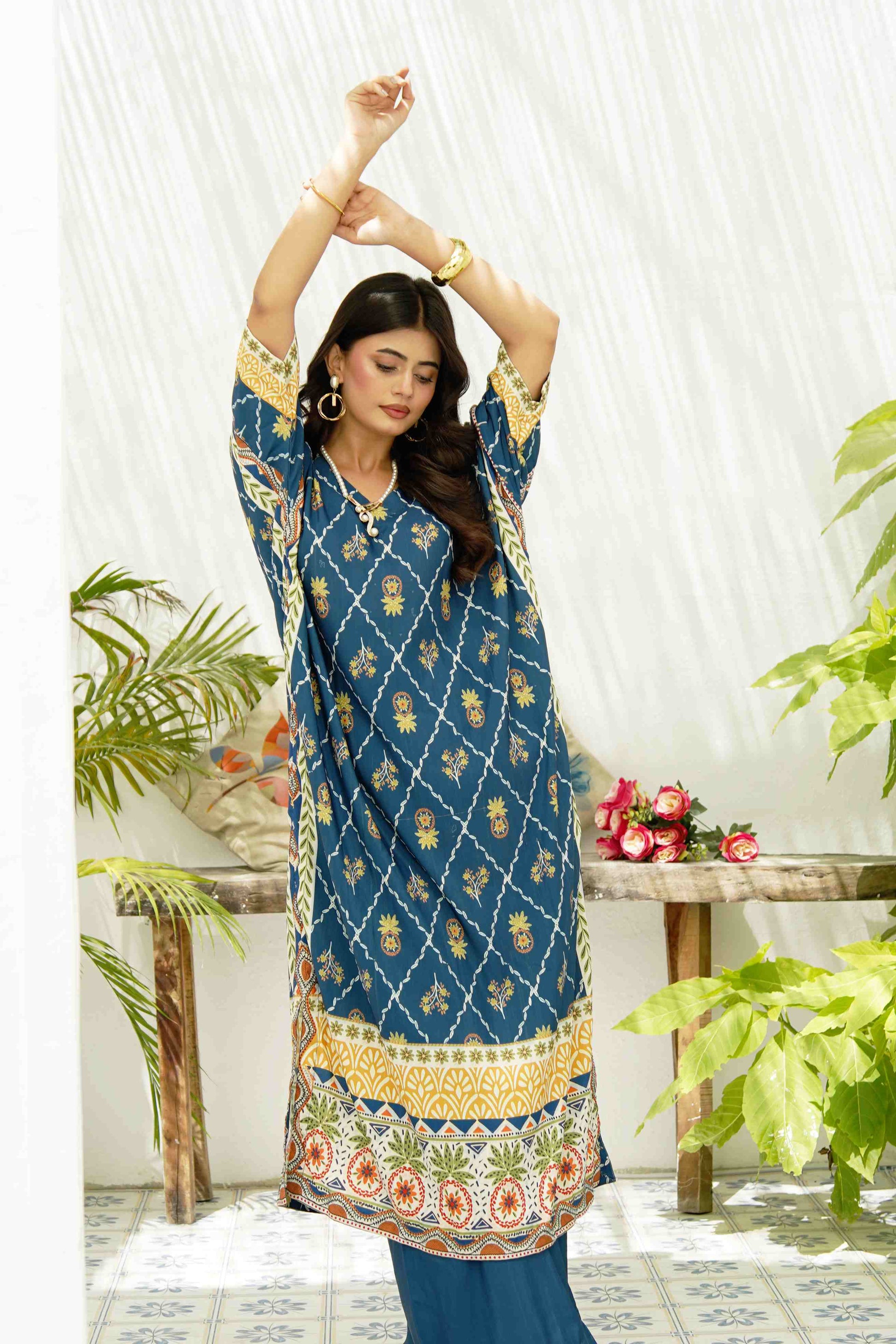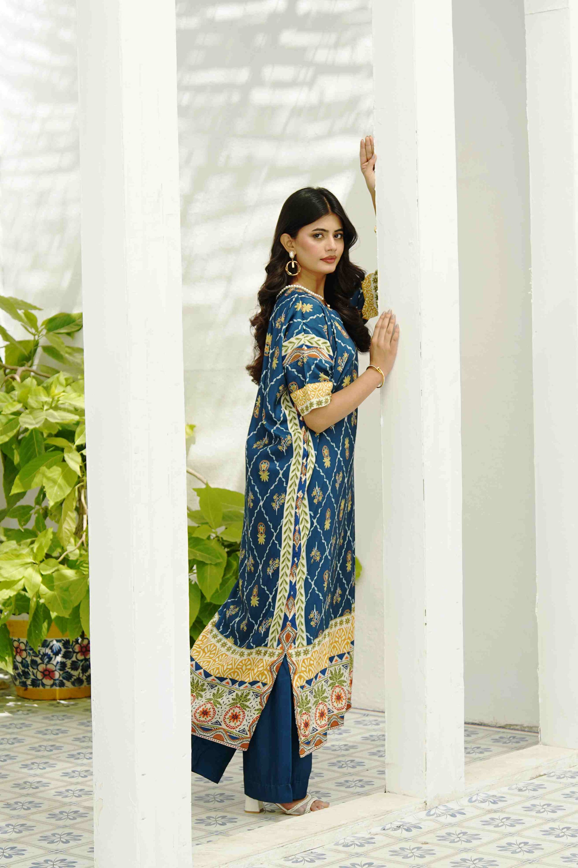 A statement in effortless luxury — this beautifully draped kaftan is crafted from Slub in a rich Navy blue tone. Embellished with detailing along the neckline, it combines fluid elegance with refined craftsmanship. Perfect for festive evenings, intimate dinners, or wedding soirées.