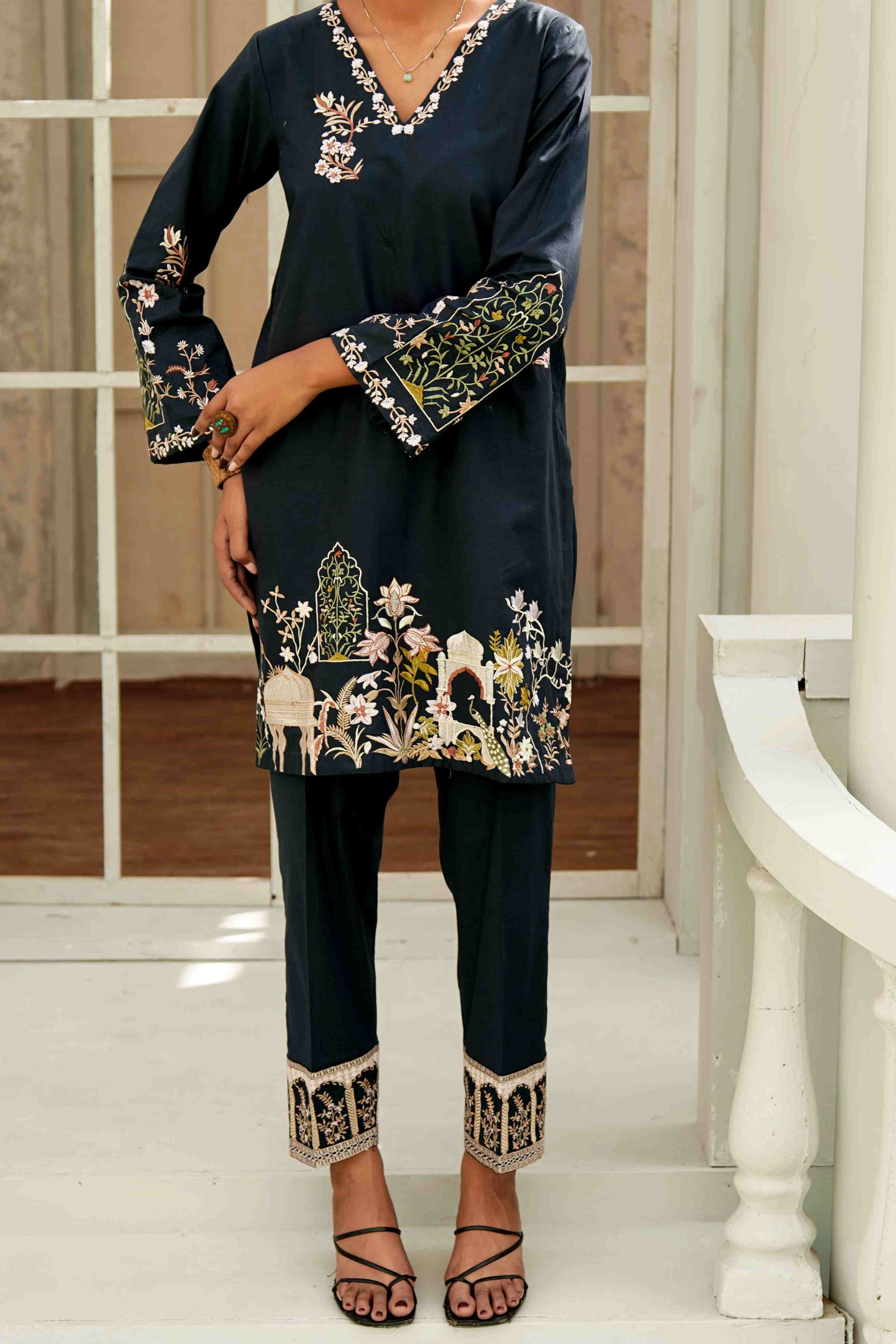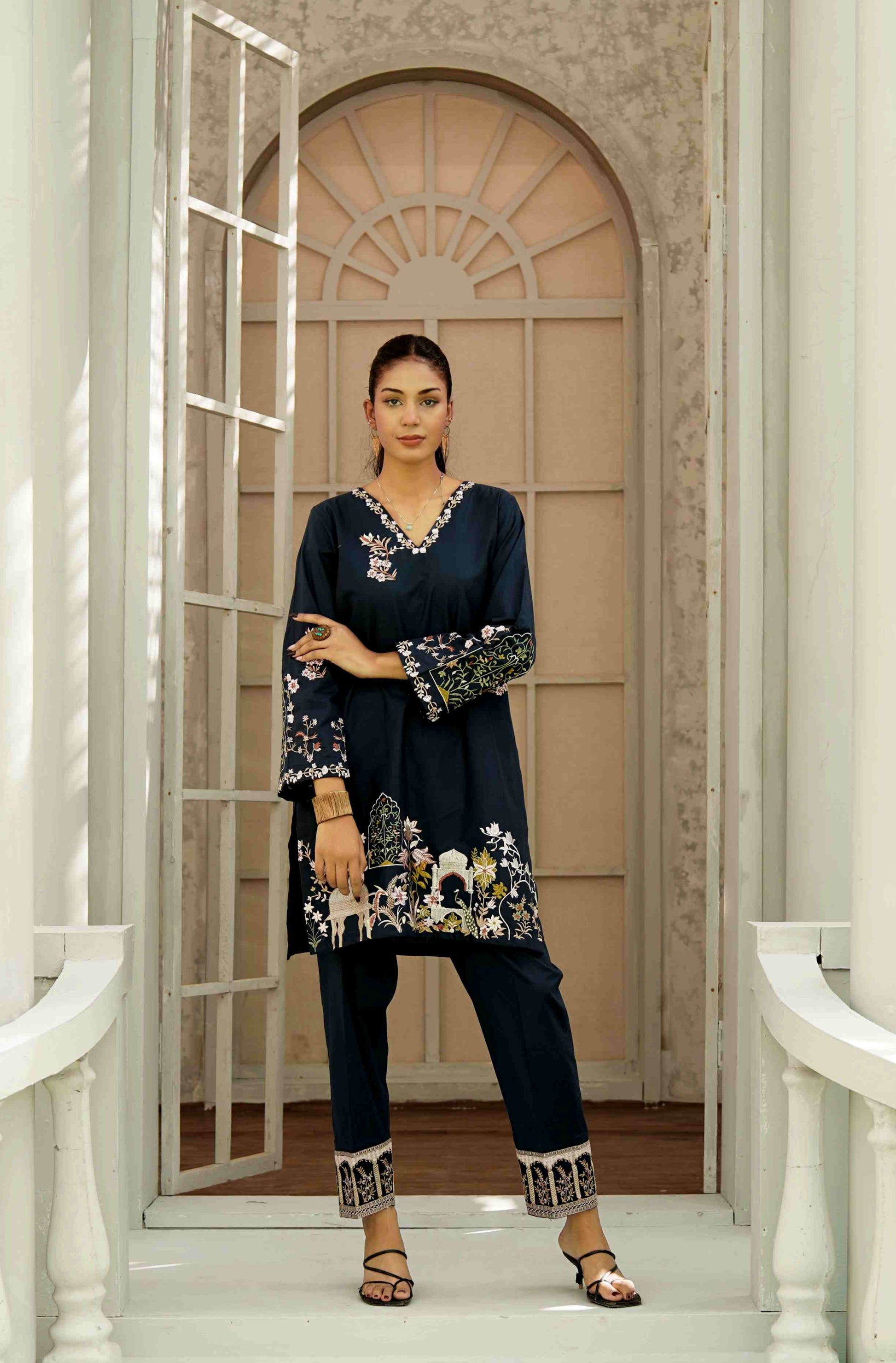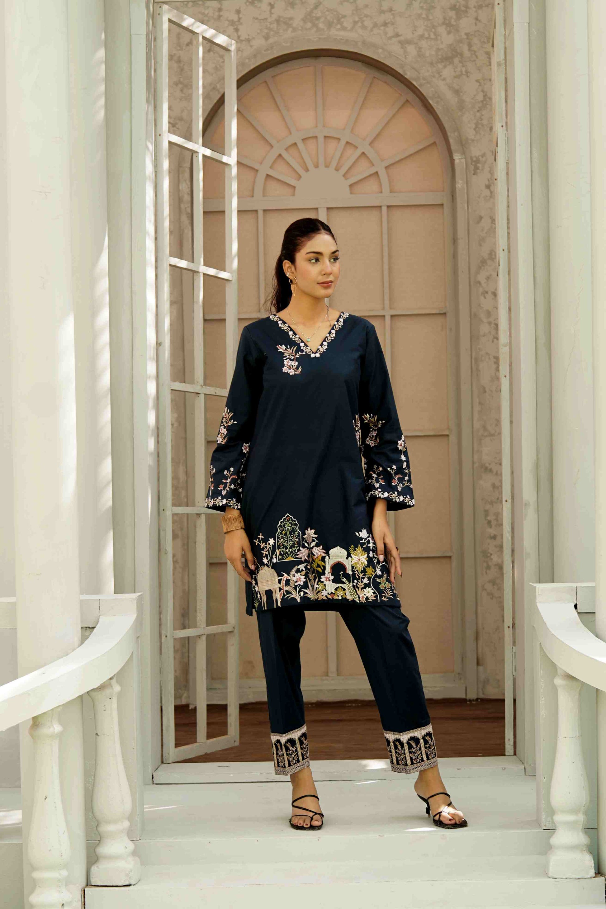 From our Signature Edit, this masterpiece reflects timeless artistry through modern design. Crafted on pure Egyptian Cotton, the ensemble showcases intricate embroidery style on a sophisticated Navy blue base. The meticulous detailing and contemporary cut make it an heirloom-worthy addition to your festive wardrobe.
