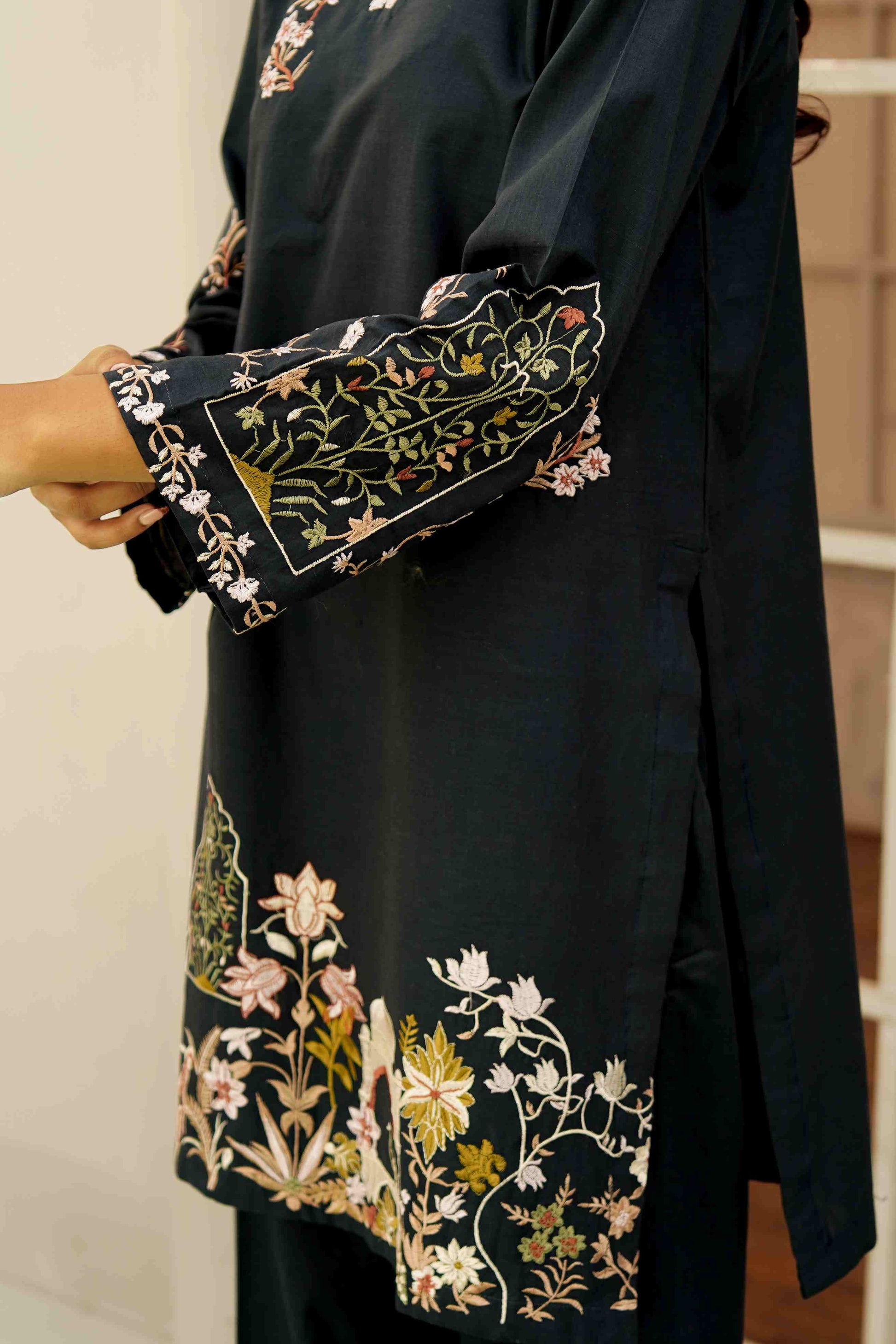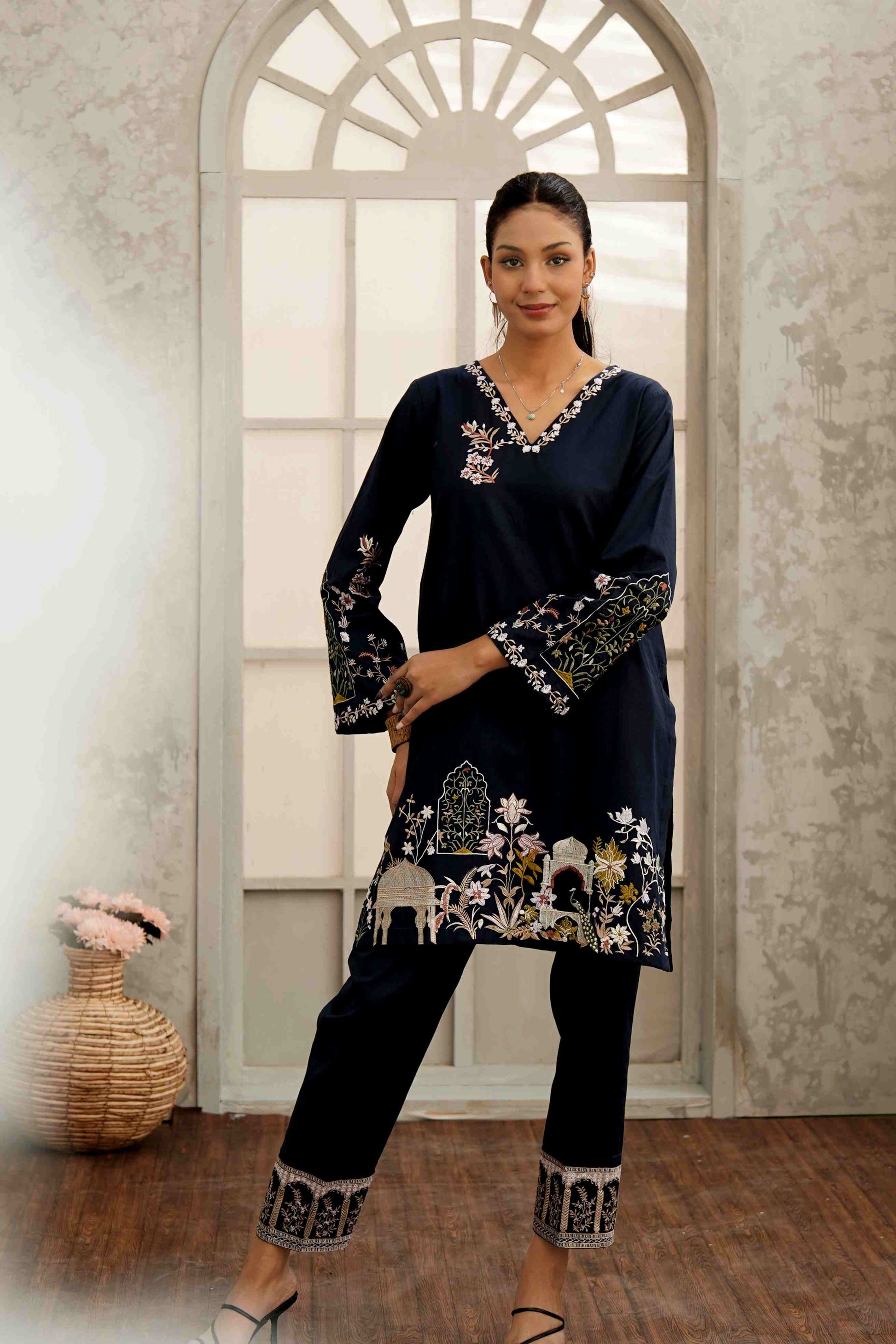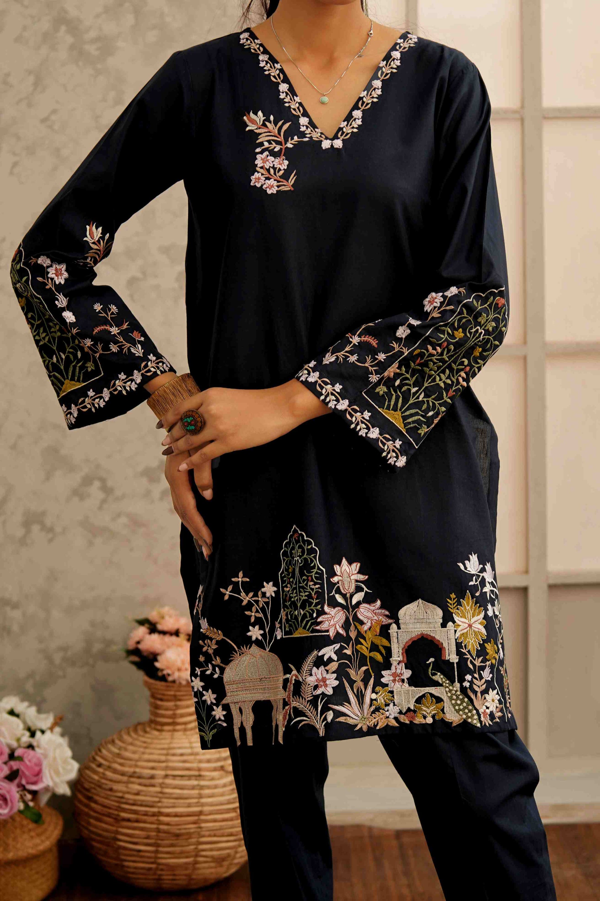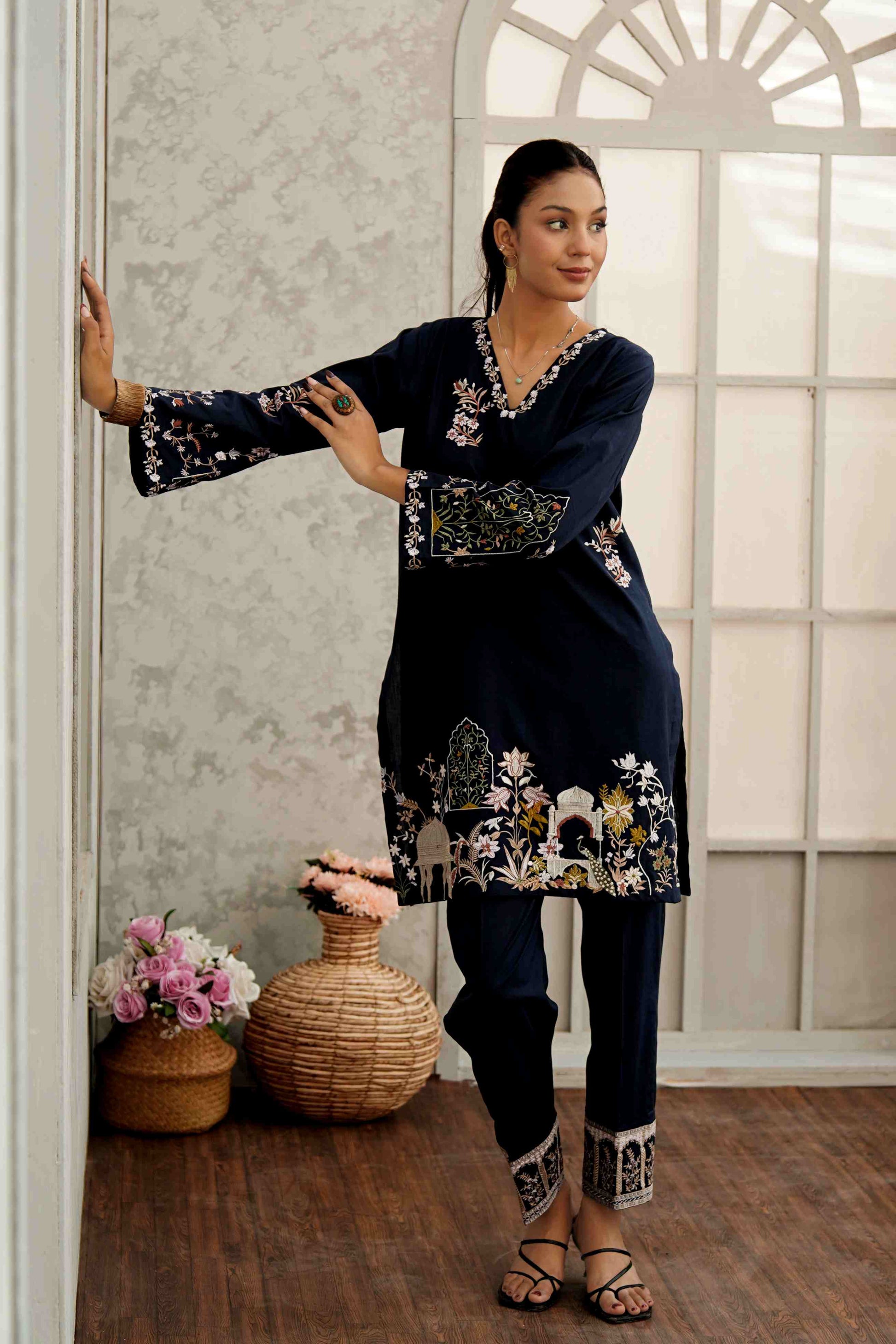 From our Signature Edit, this masterpiece reflects timeless artistry through modern design. Crafted on pure Egyptian Cotton, the ensemble showcases intricate embroidery style on a sophisticated Navy blue base. The meticulous detailing and contemporary cut make it an heirloom-worthy addition to your festive wardrobe.
