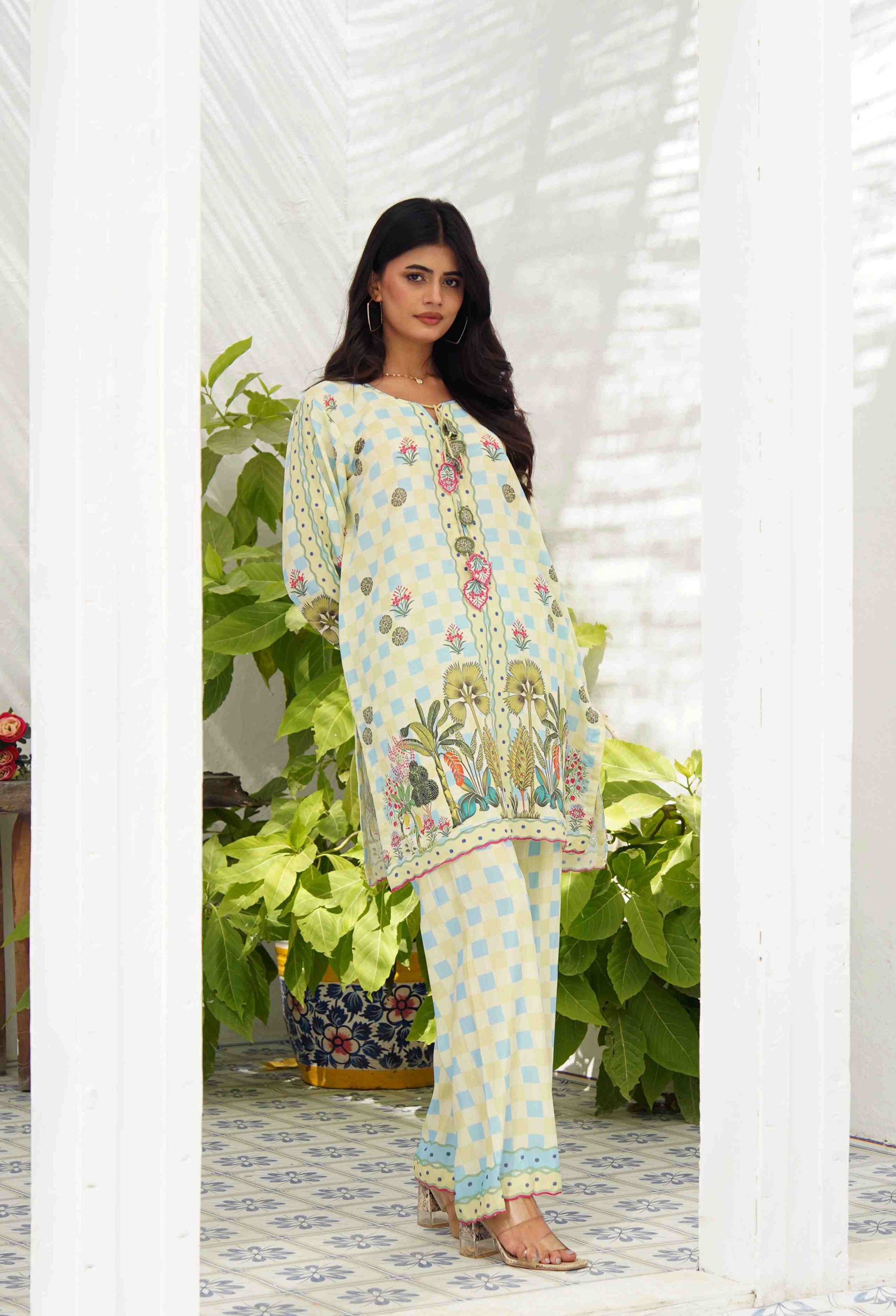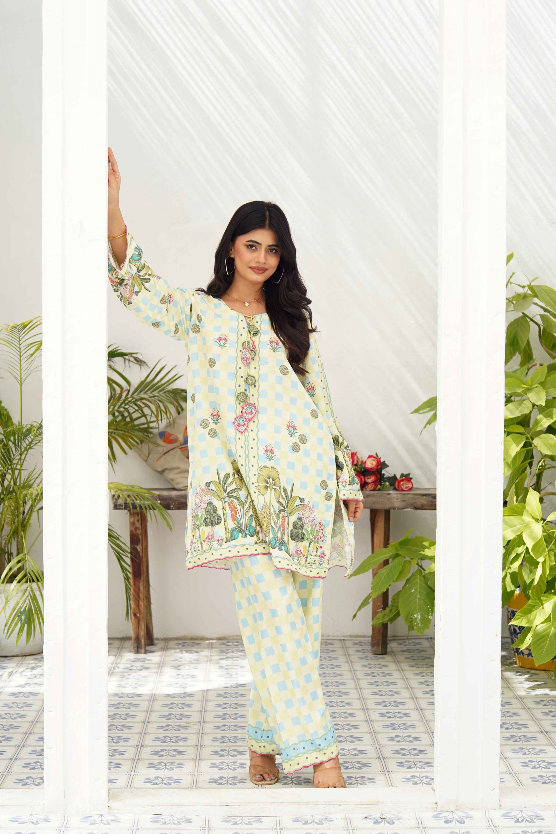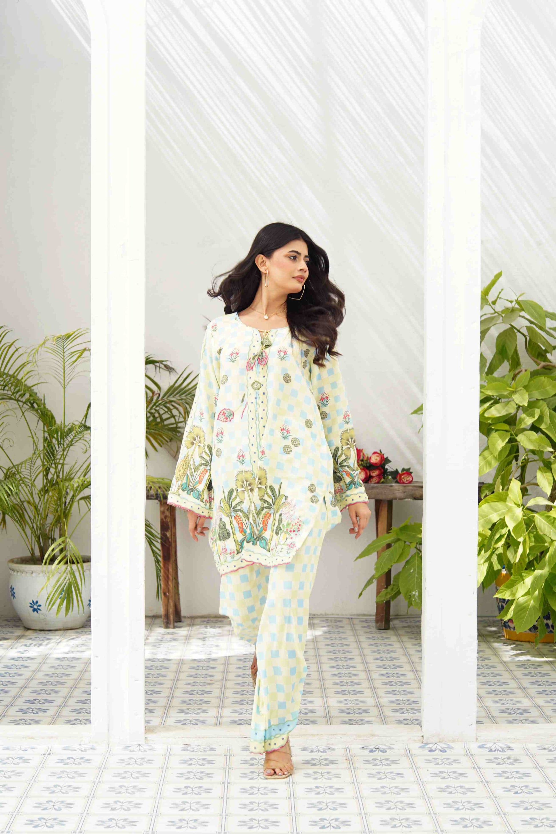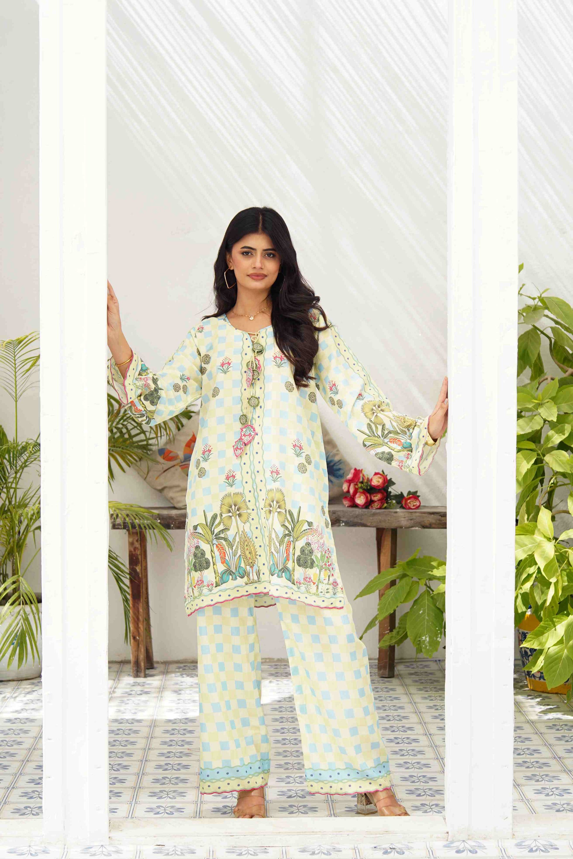 Add effortless charm to your wardrobe with this printed co-ord set crafted from soft Slub. Featuring a floral, geometric pattern Styled with a dori work, the set pairs a shirt with matching culottes. Perfect for casual outings, brunches, or everyday wear.