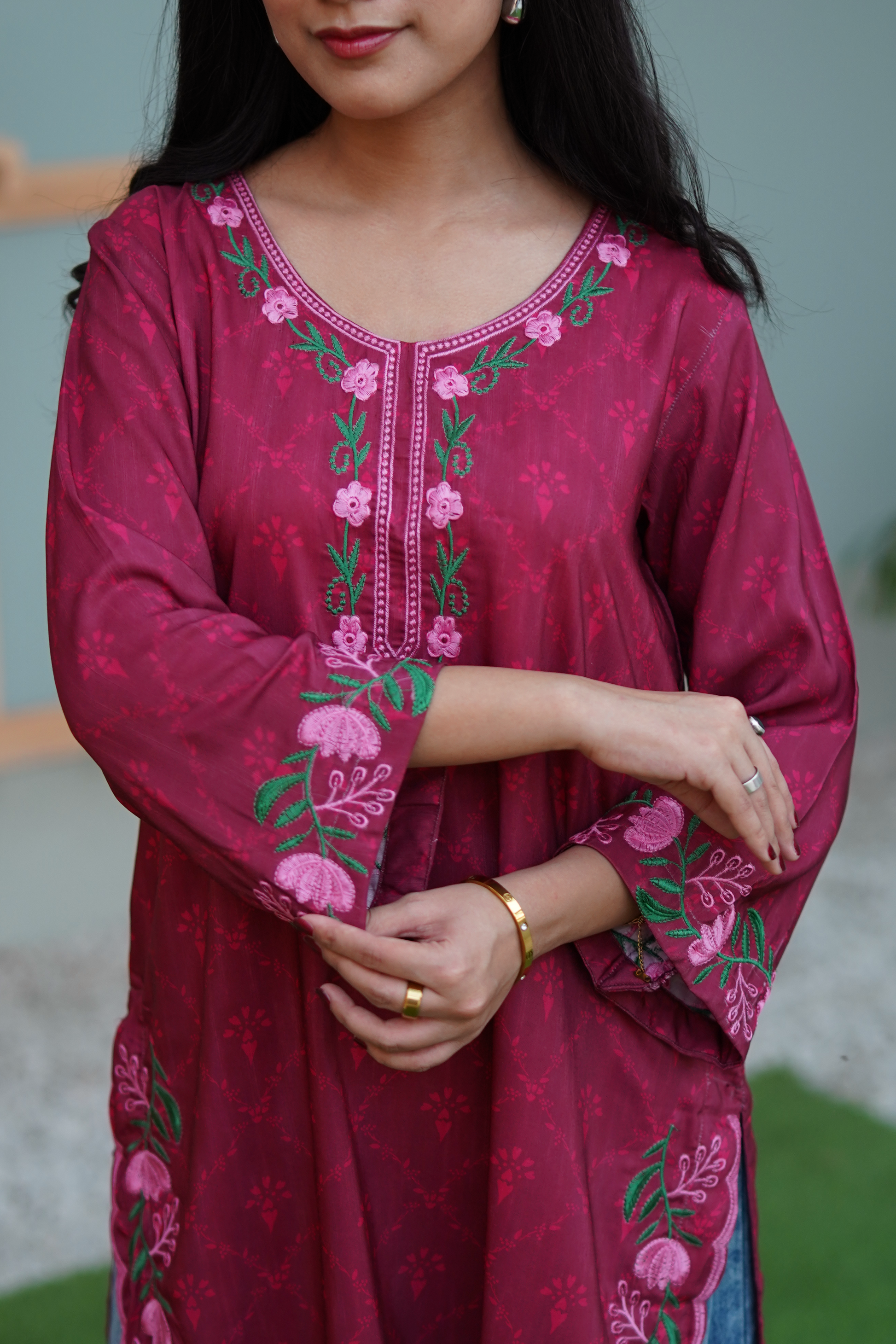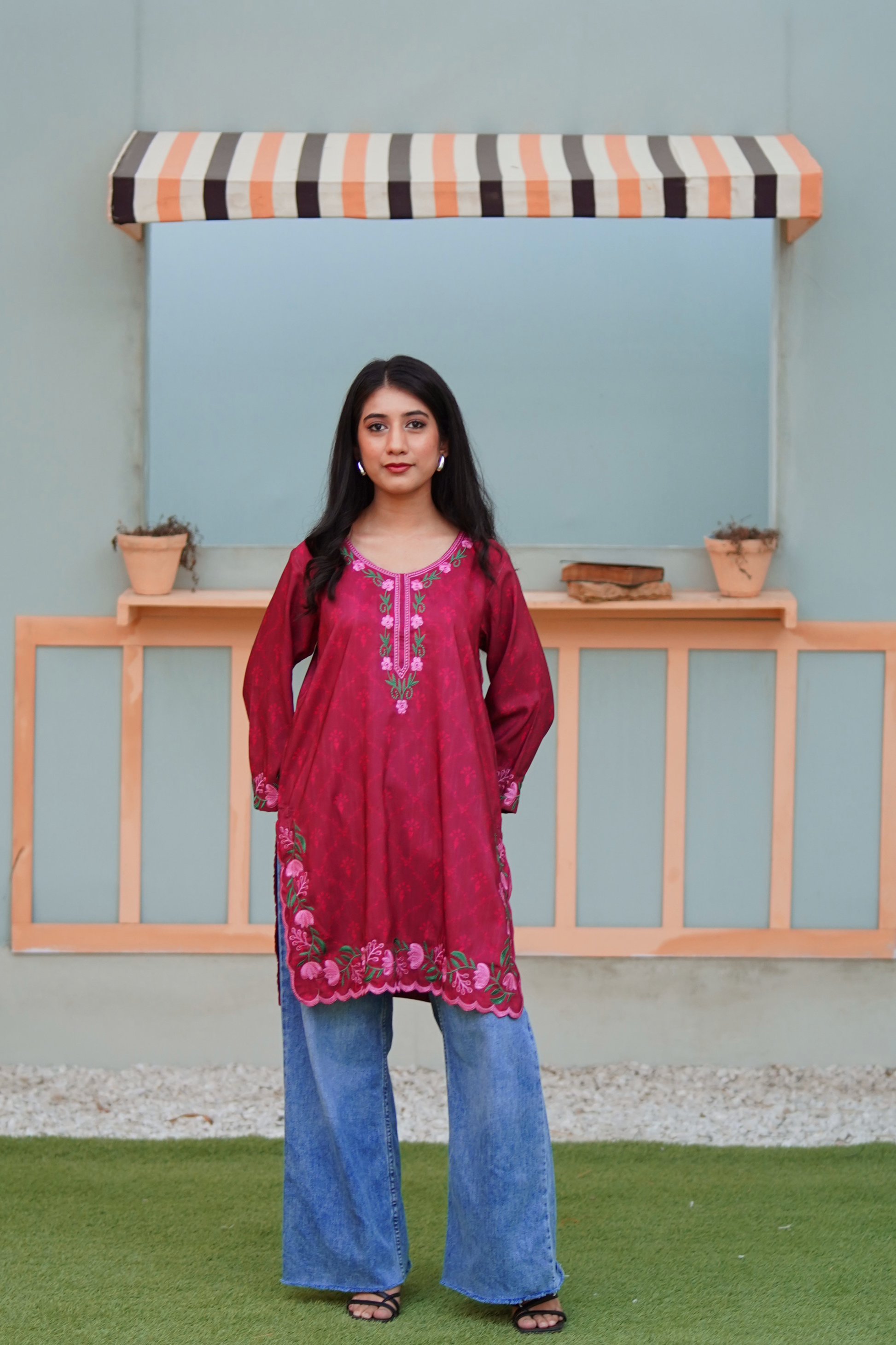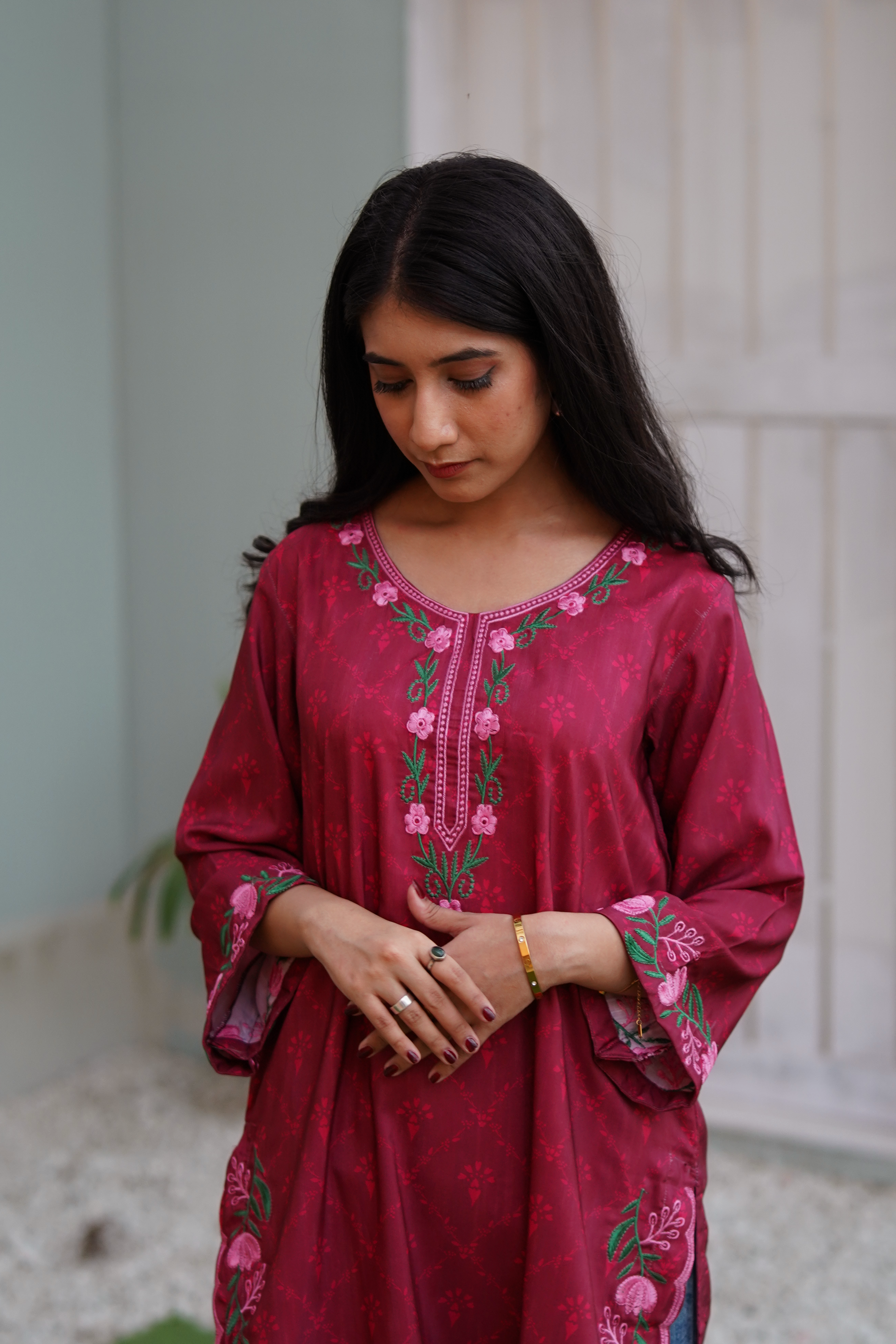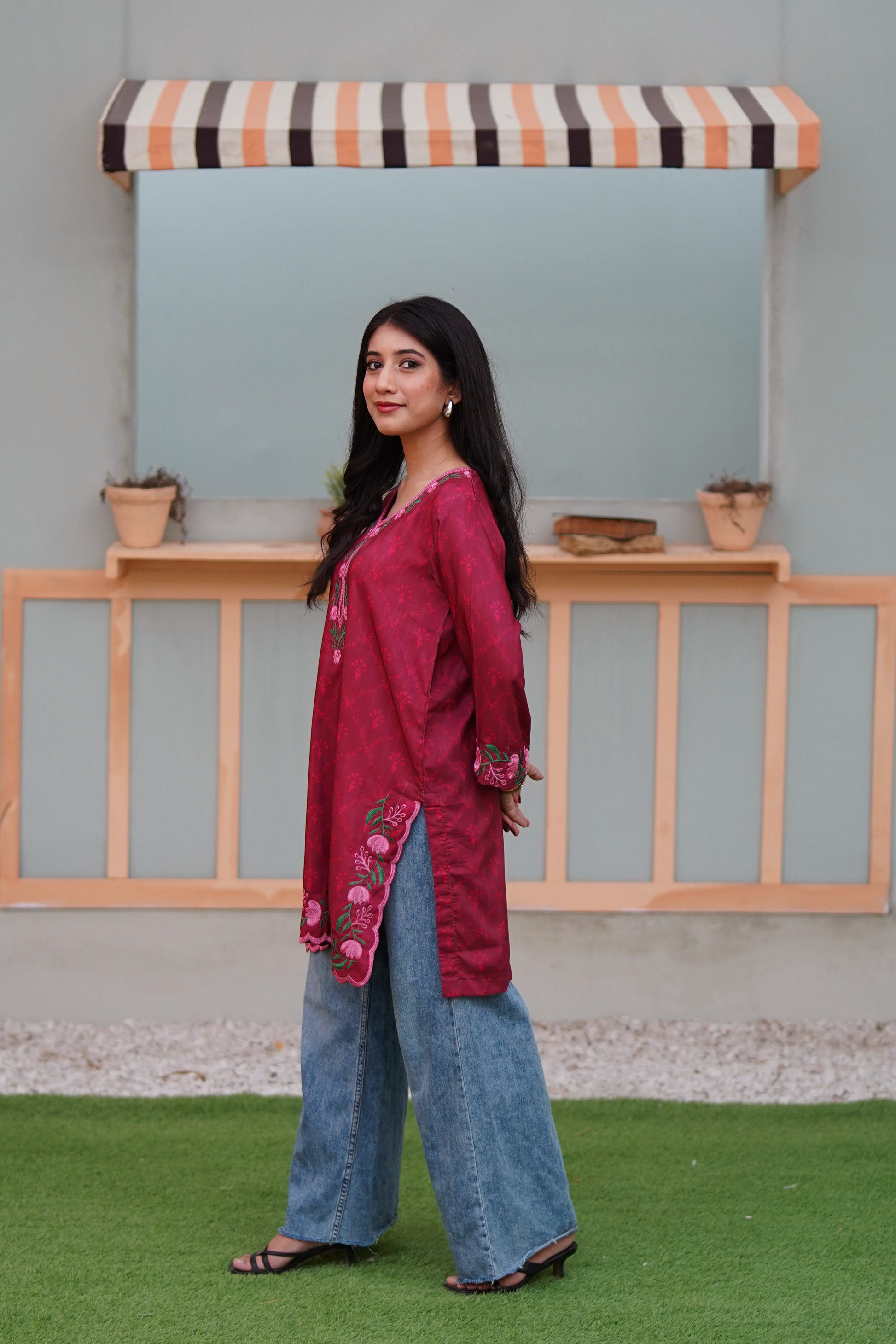 Magenta Bloom Kurti Elevate your ethnic wardrobe with this striking magenta kurti, designed to make a sophisticated statement. The rich, jewel-toned hue complements a range of skin tones while the traditional silhouette ensures comfortable, all-day wear. Perfect for casual gatherings, festive occasions, or everyday elegance, this piece combines timeless design with contemporary appeal. Crafted for the modern woman who values both style and comfort, it pairs effortlessly with churidars, leggings, or palazzos for versatile styling options.