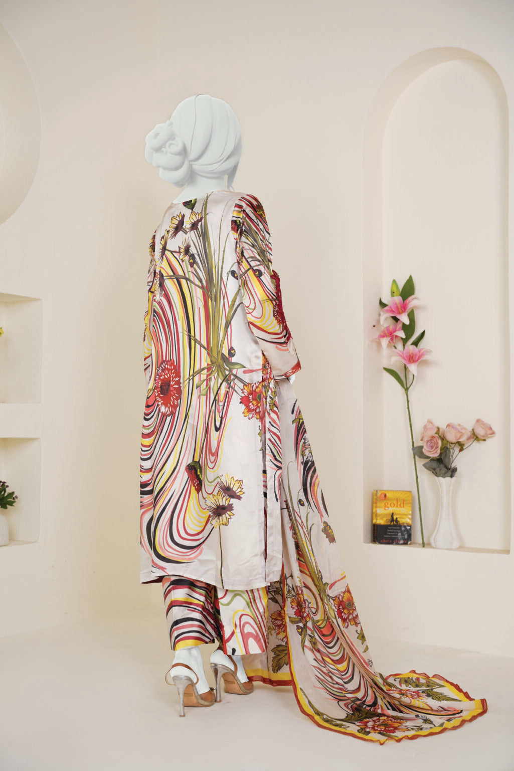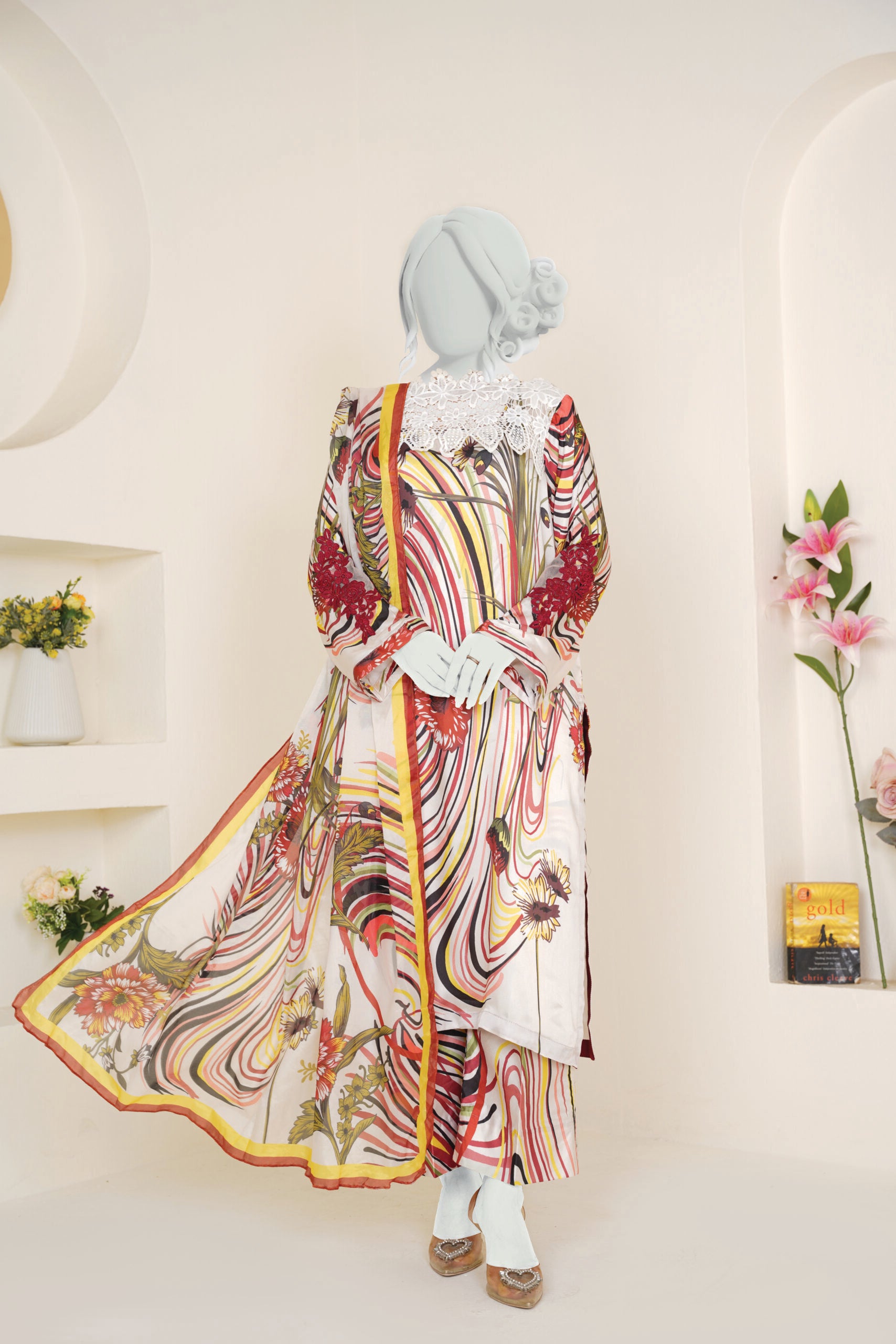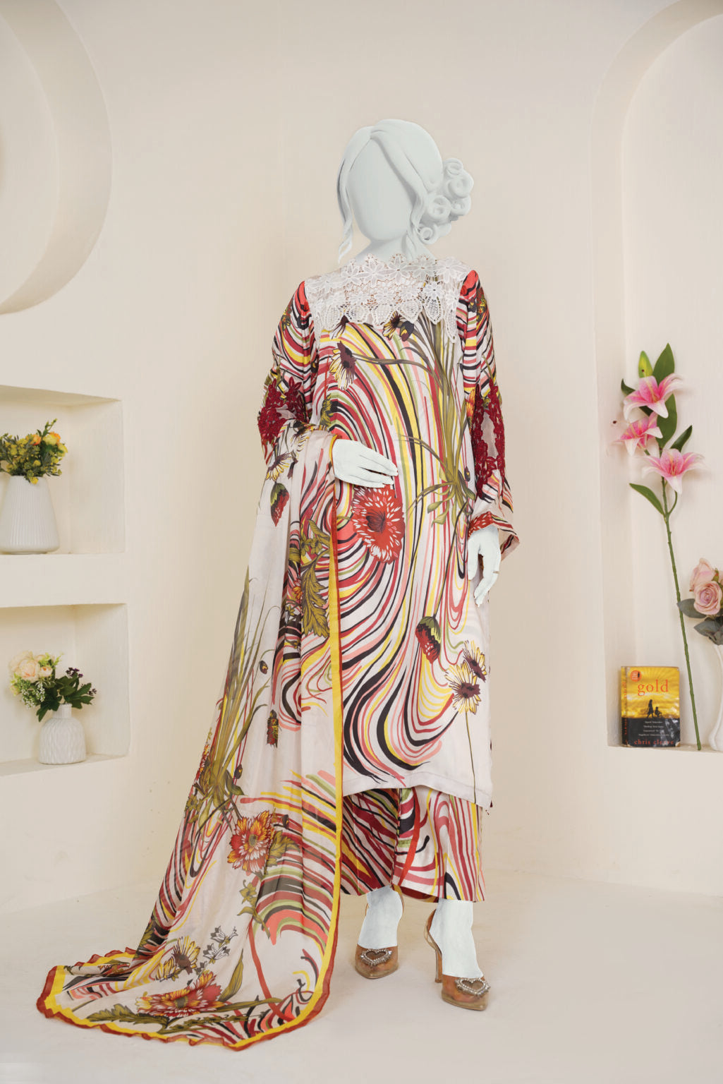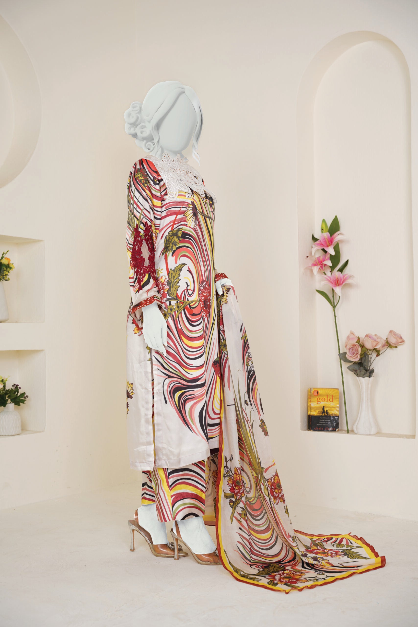 A vibrant printed silk suit featuring a swirl of colors, floral accents, and delicate lace neckline. Comes with matching trousers and a flowy organza dupatta — perfect for festive or formal