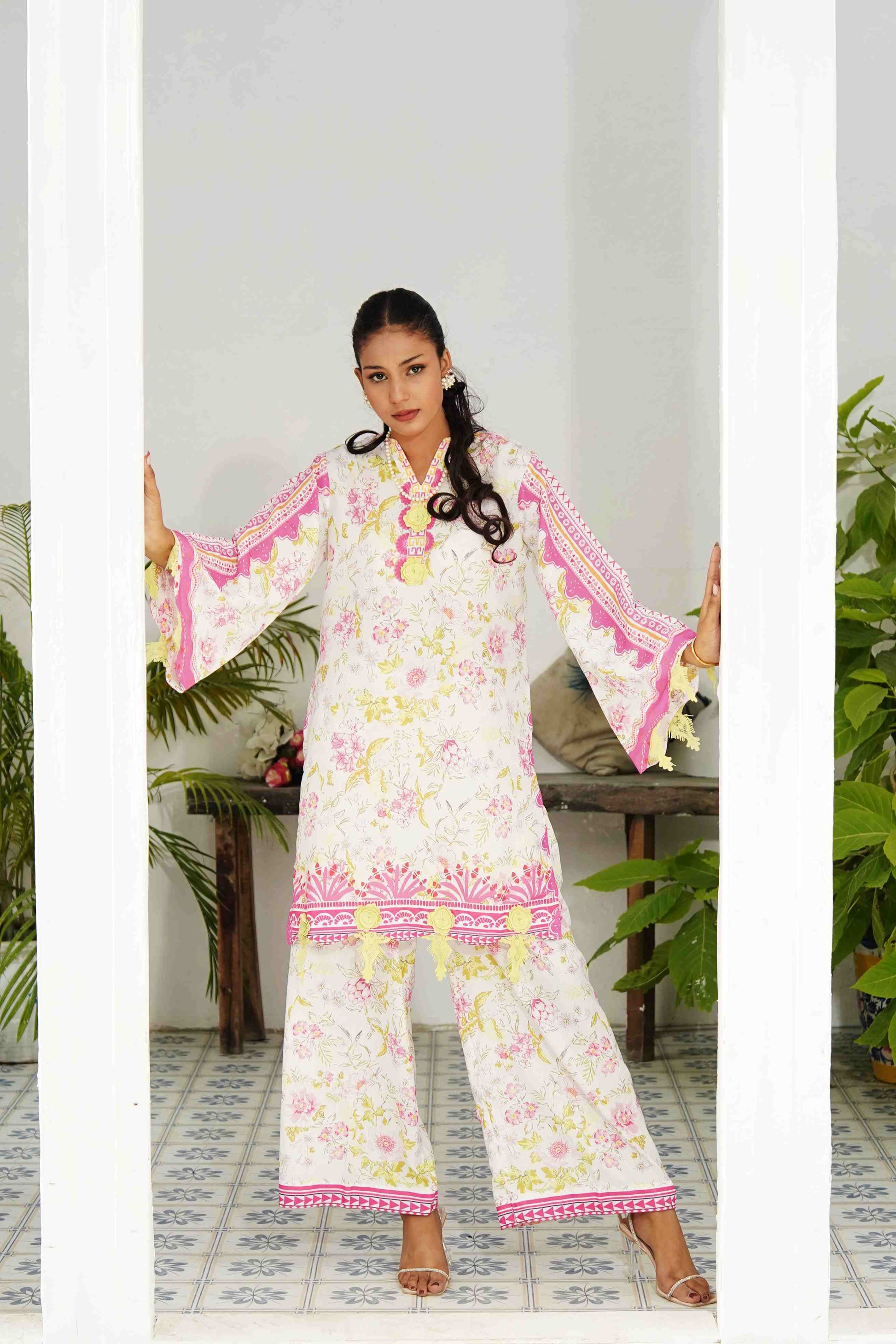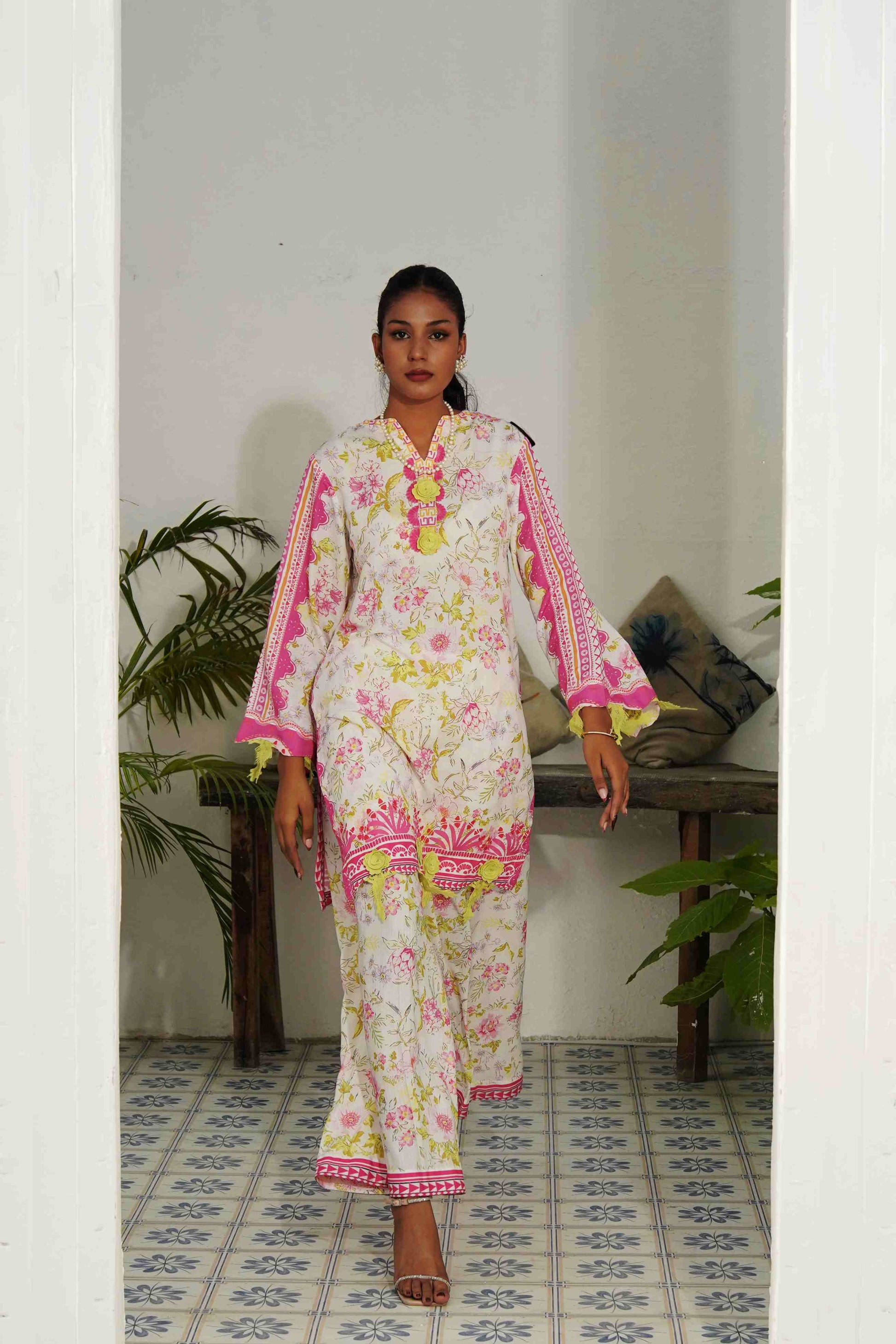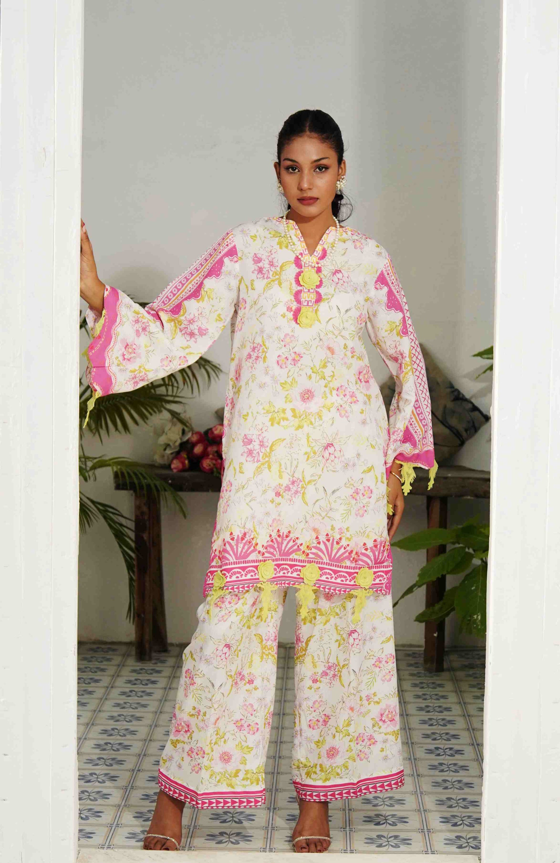 Add effortless charm to your wardrobe with this printed co-ord set crafted from soft Linéa Cambric. Featuring a floral, geometric pattern Styled with a bunch work, the set pairs a shirt with matching culottes. Perfect for casual outings, brunches, or everyday wear.