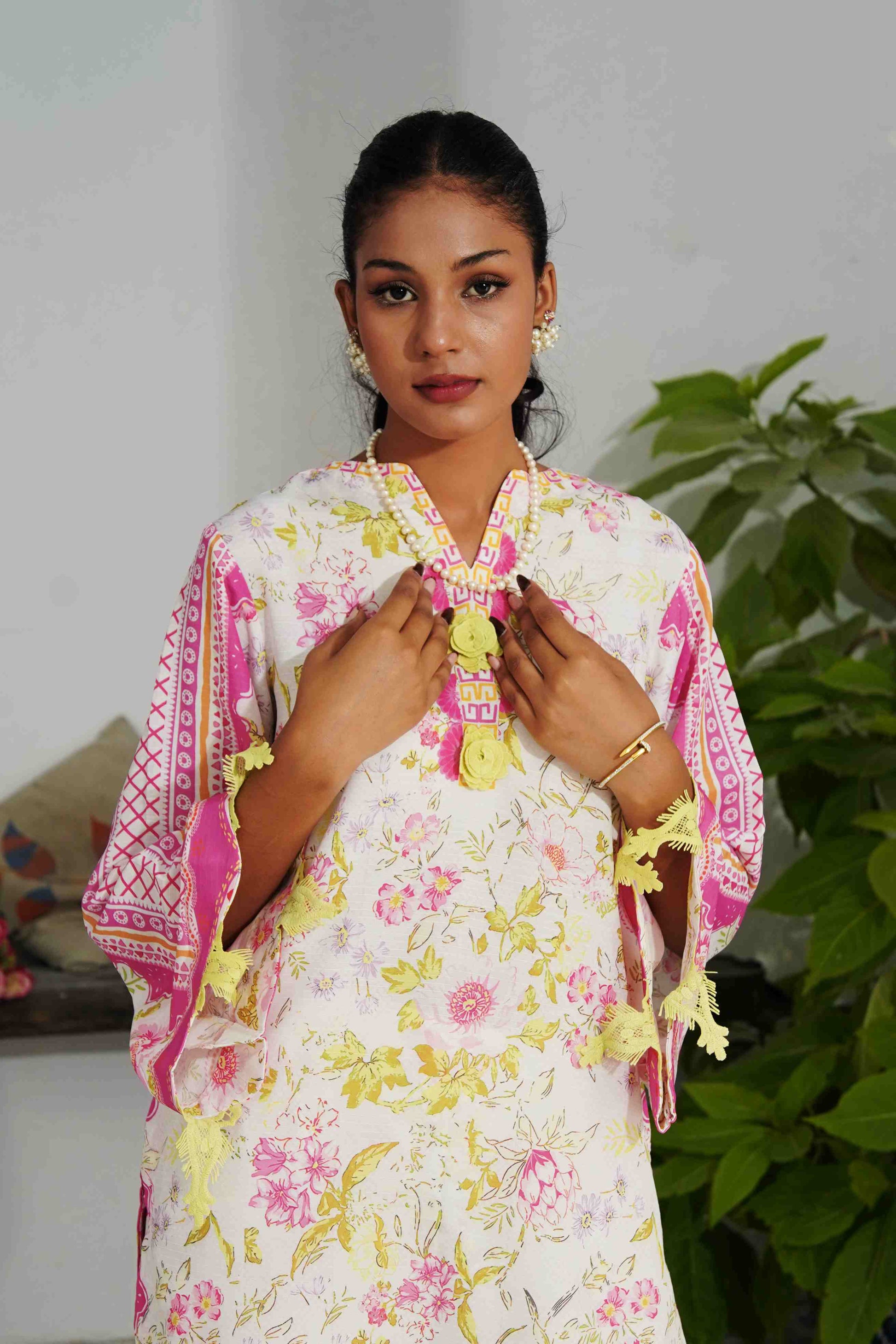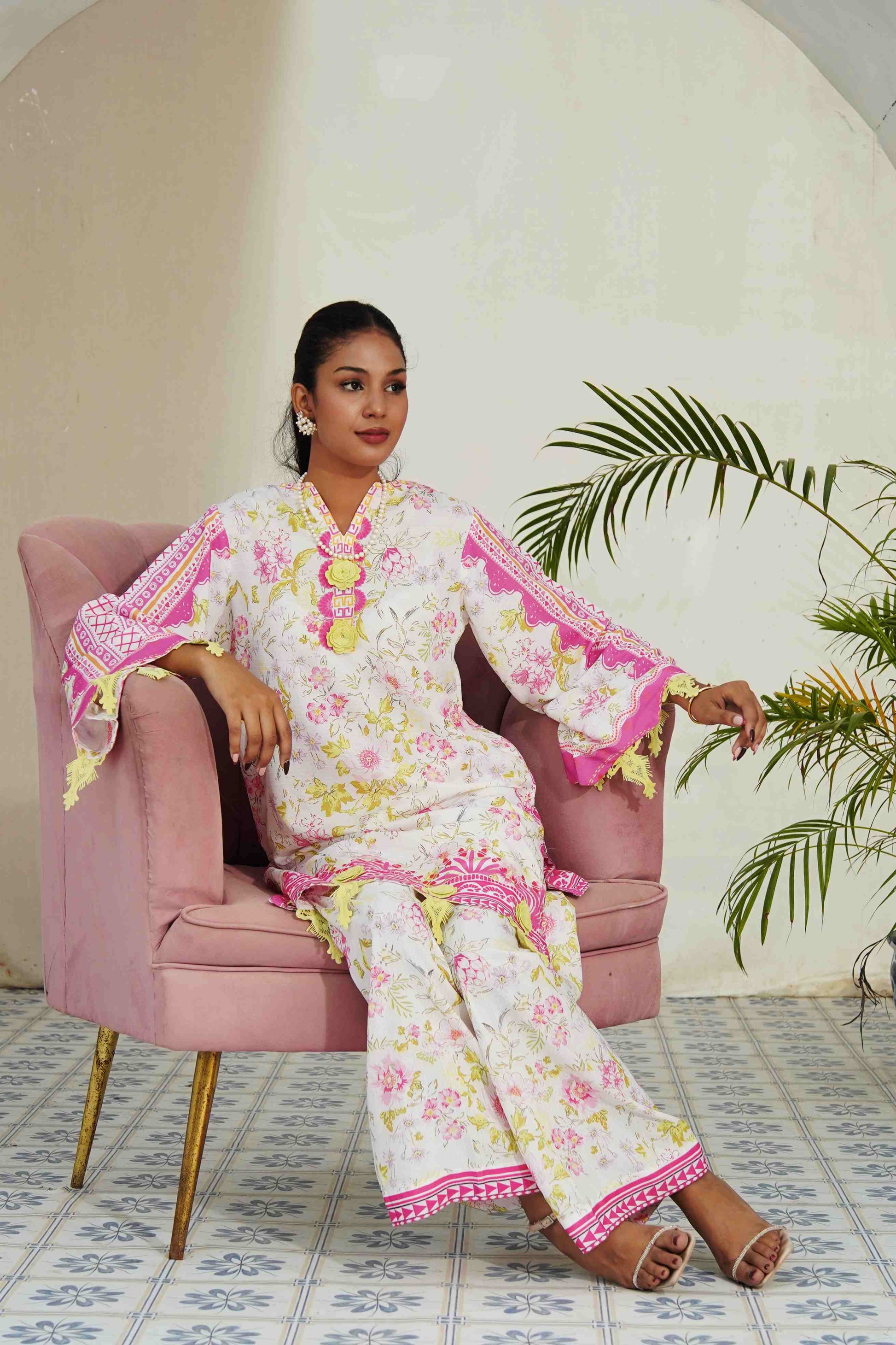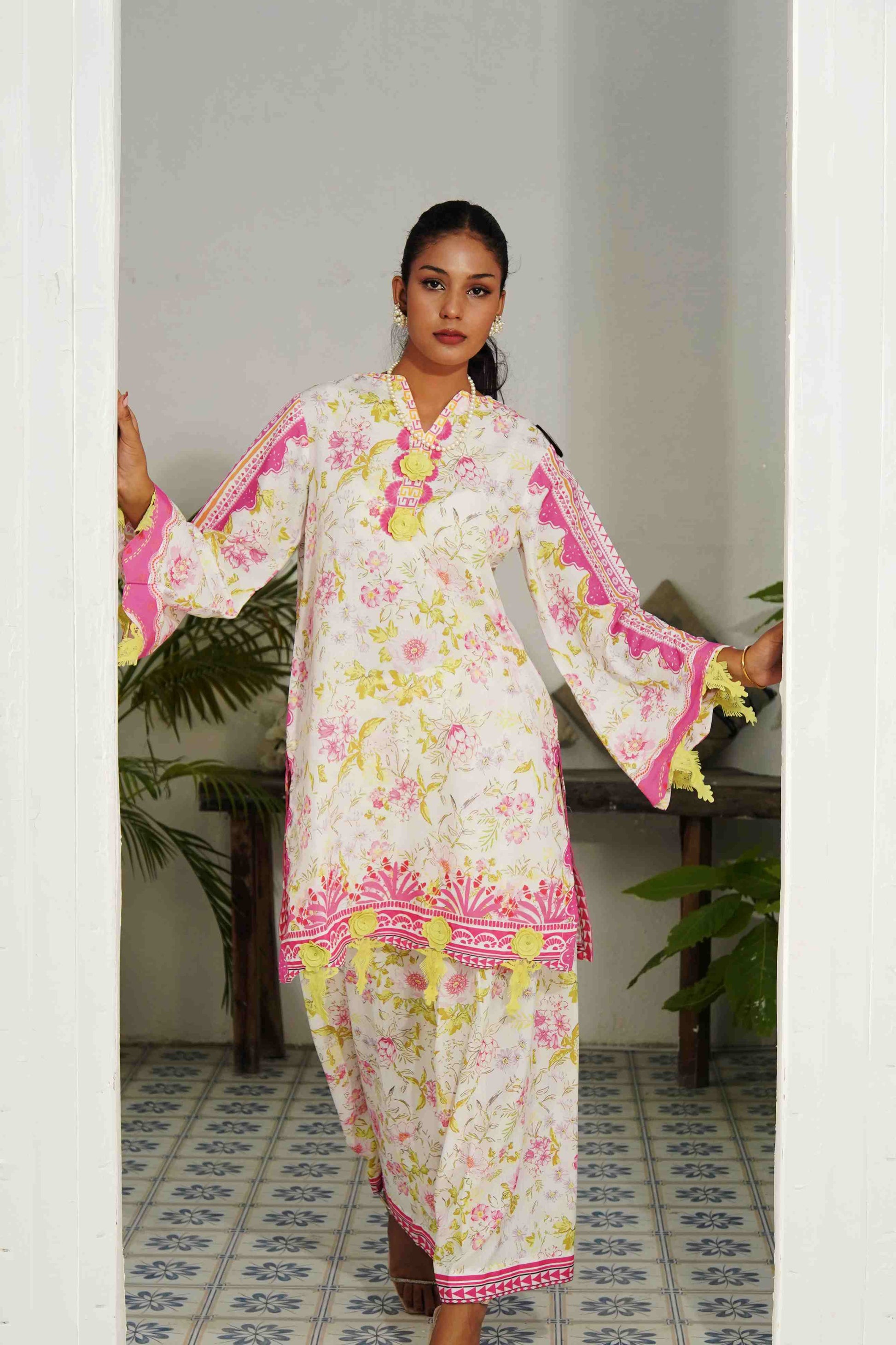 Add effortless charm to your wardrobe with this printed co-ord set crafted from soft Linéa Cambric. Featuring a floral, geometric pattern Styled with a bunch work, the set pairs a shirt with matching culottes. Perfect for casual outings, brunches, or everyday wear.
