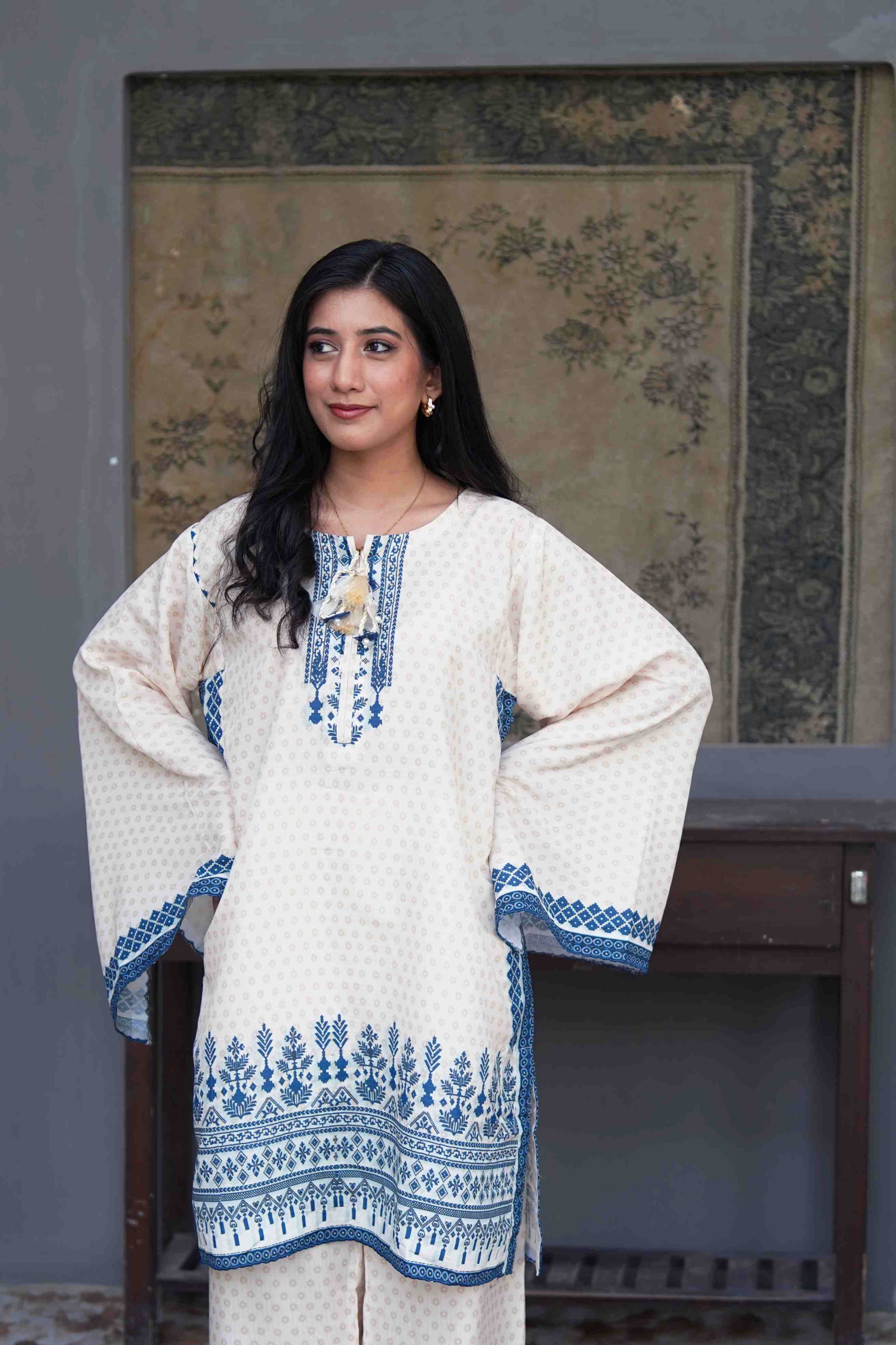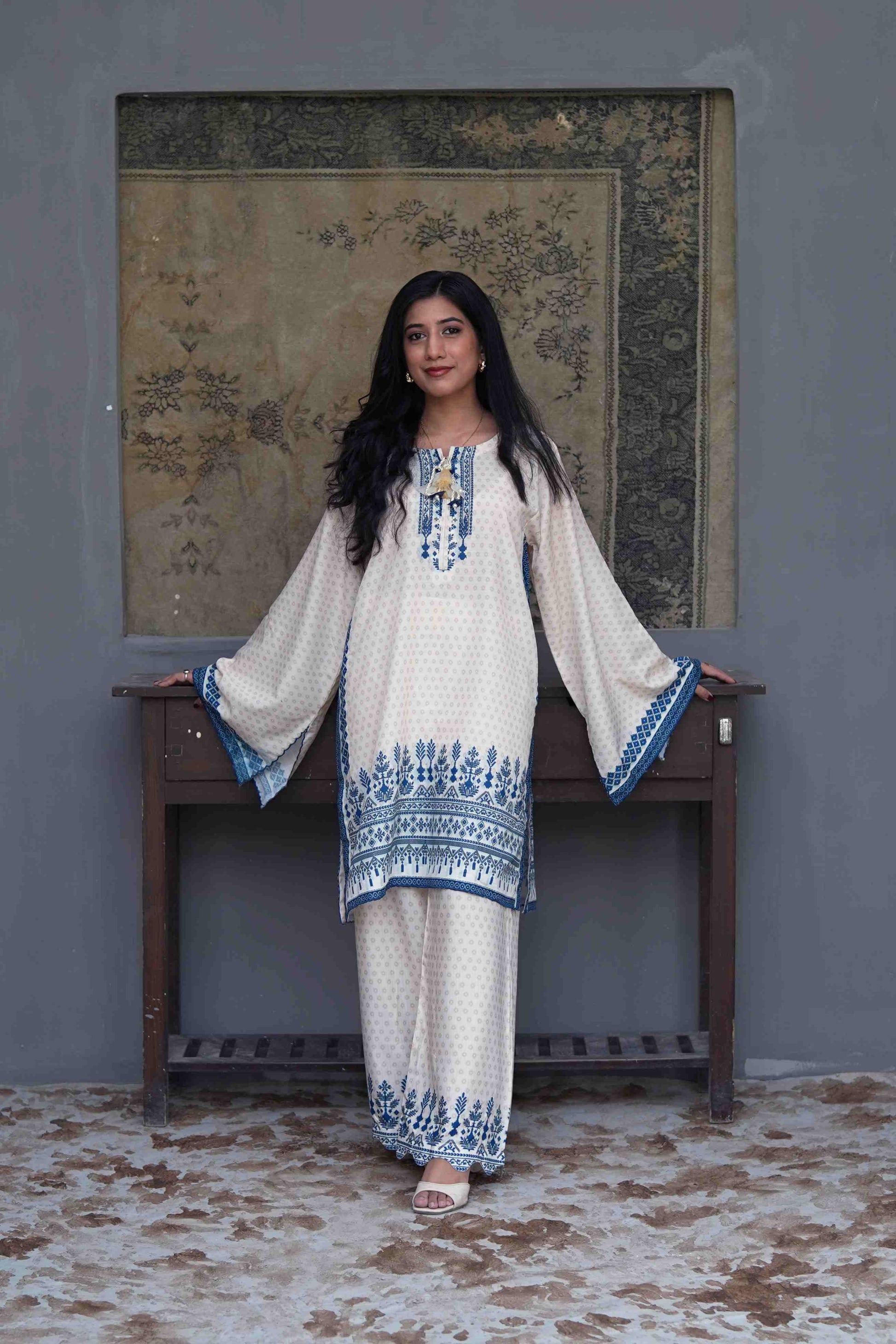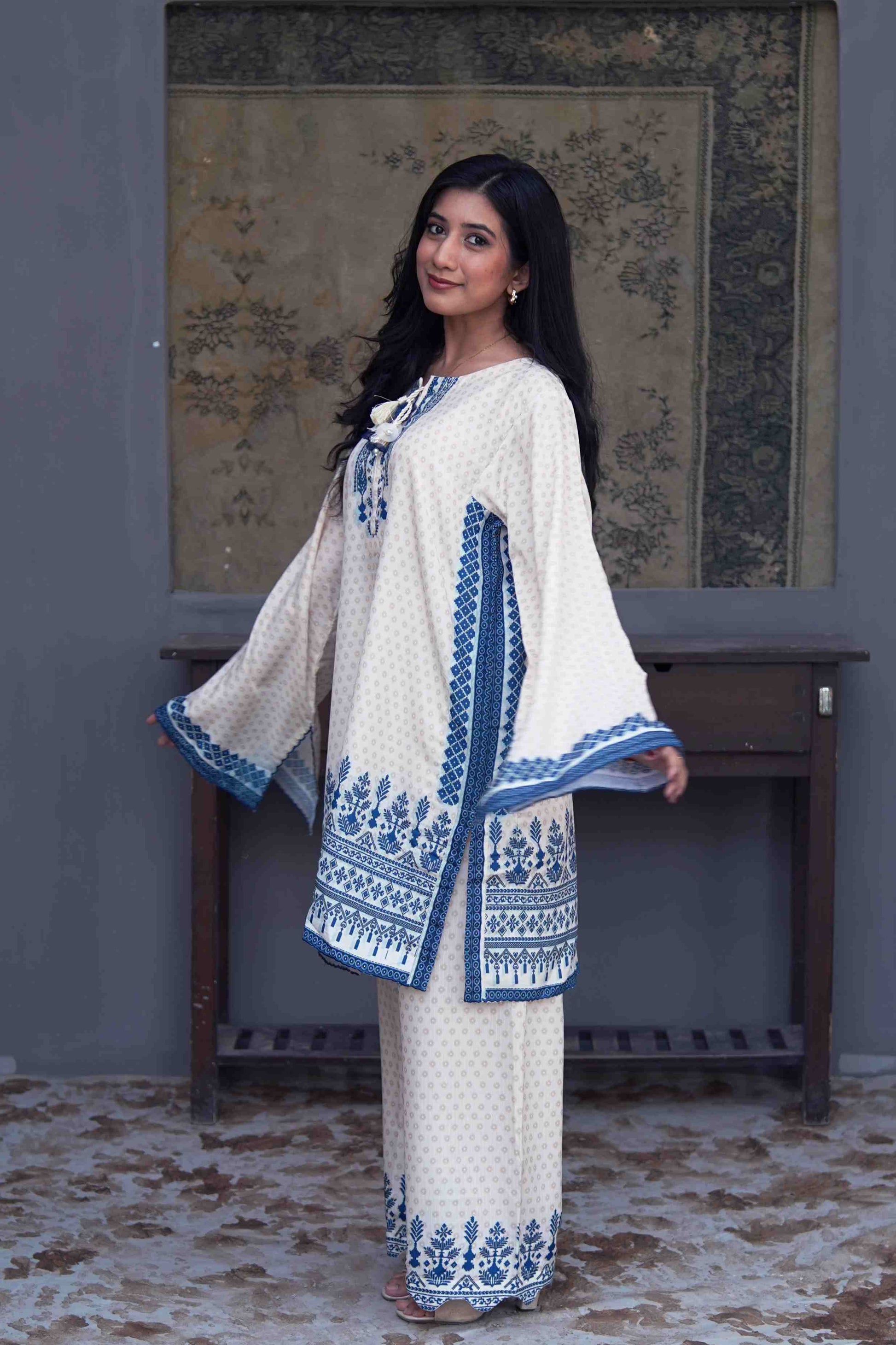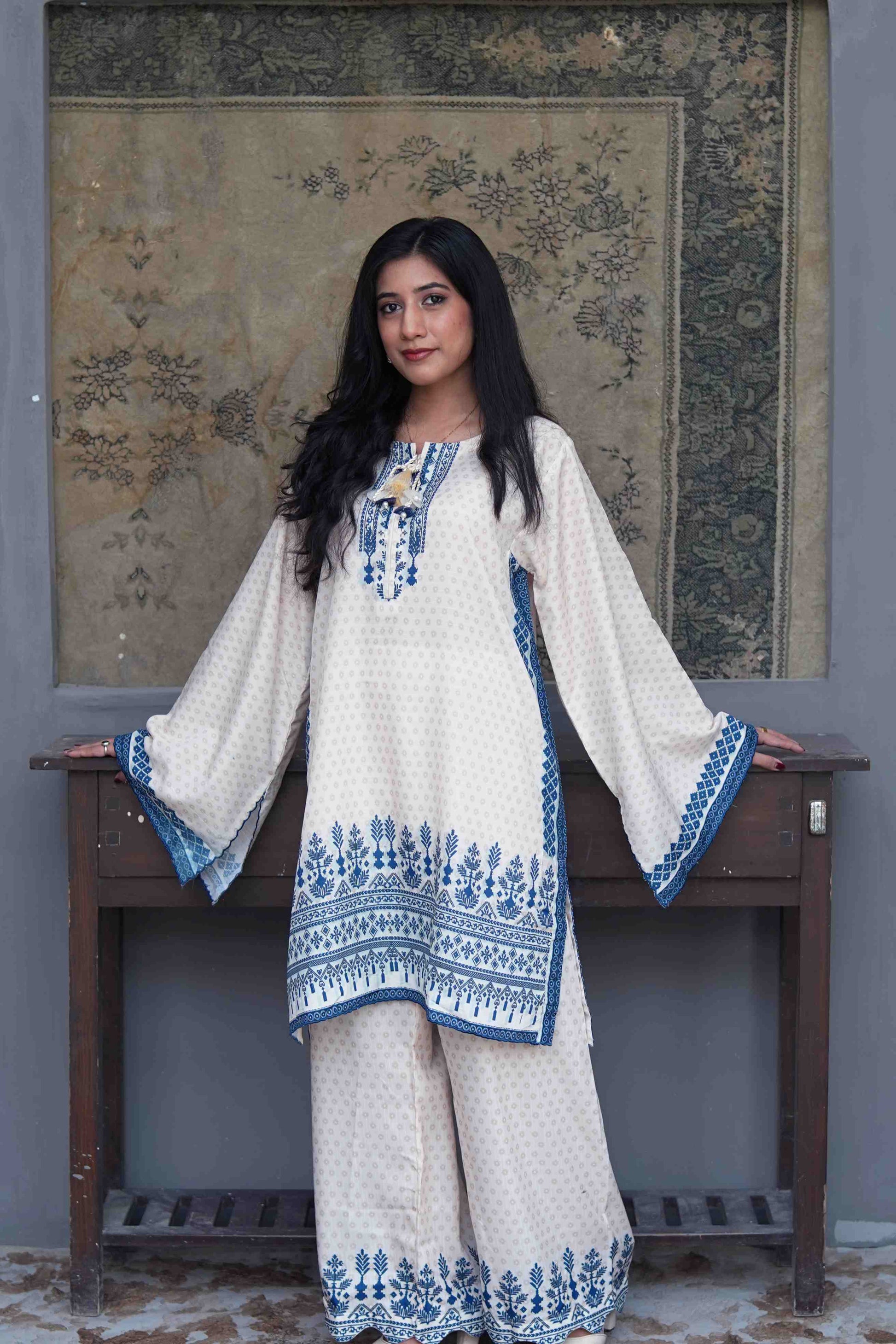 Add effortless charm to your wardrobe with this printed co-ord set crafted from soft Linéa Cambric. Featuring a floral, geometric pattern Styled with a Dori work, the set pairs a shirt with matching culottes. Perfect for casual outings, brunches, or everyday wear.