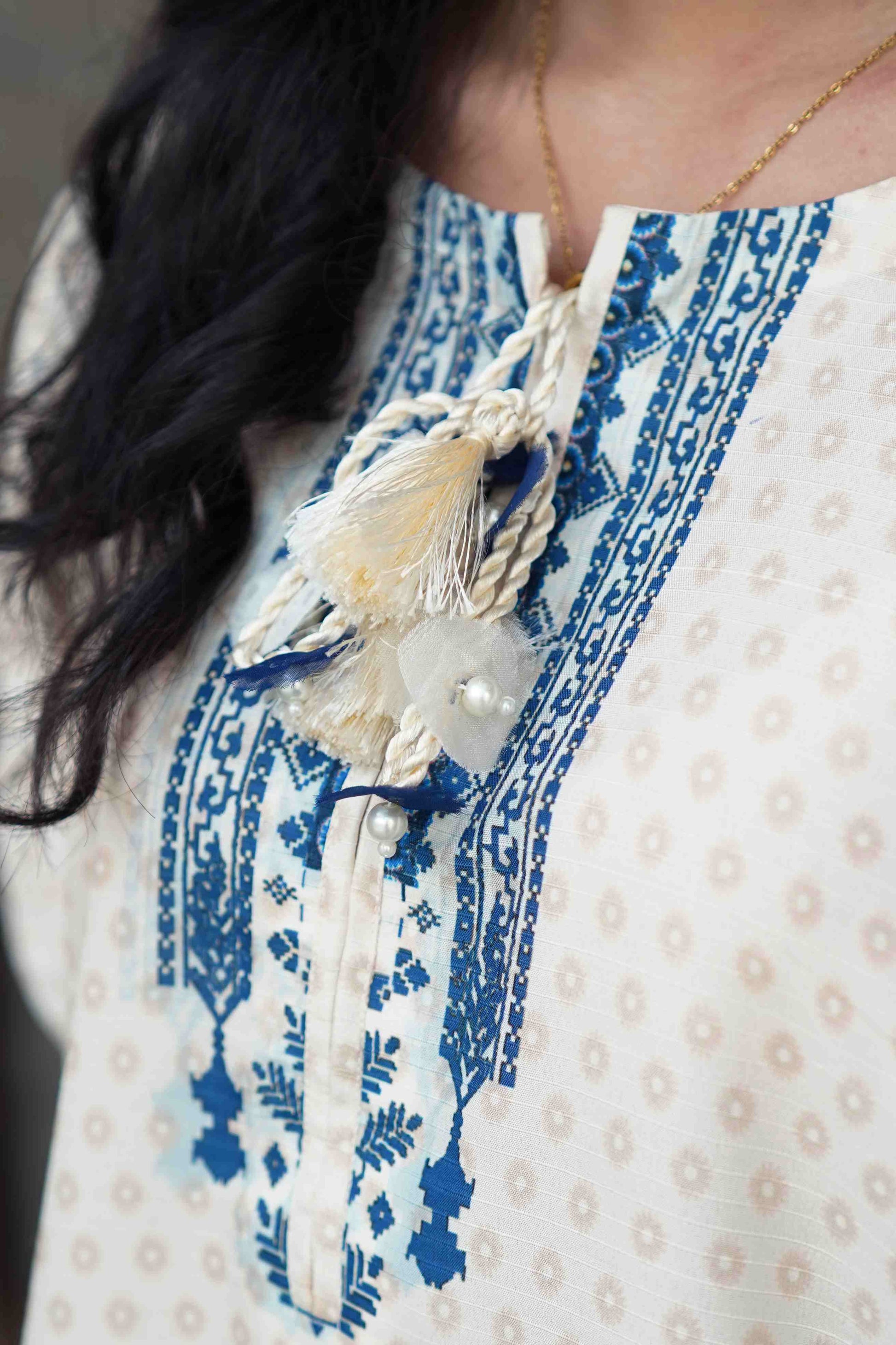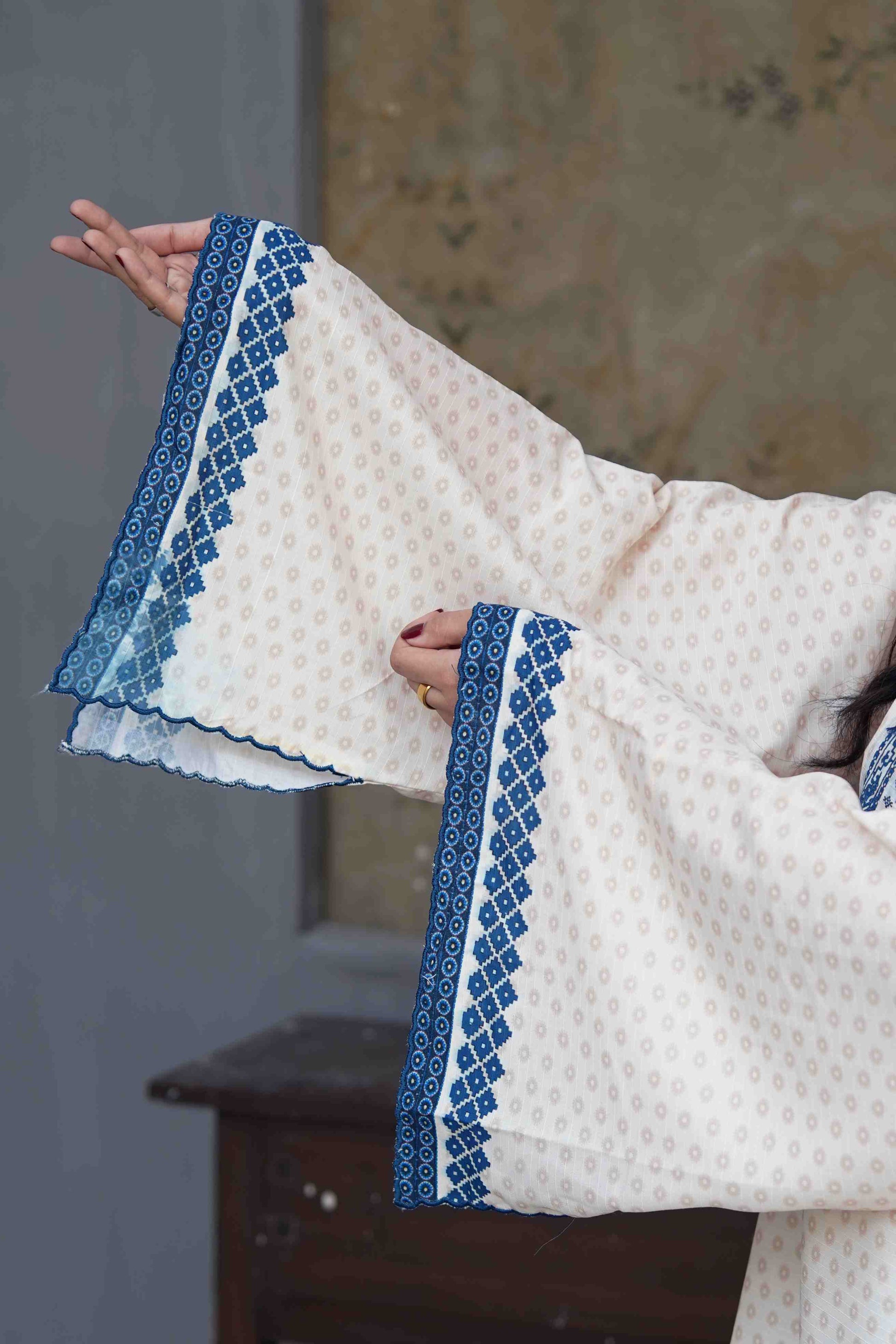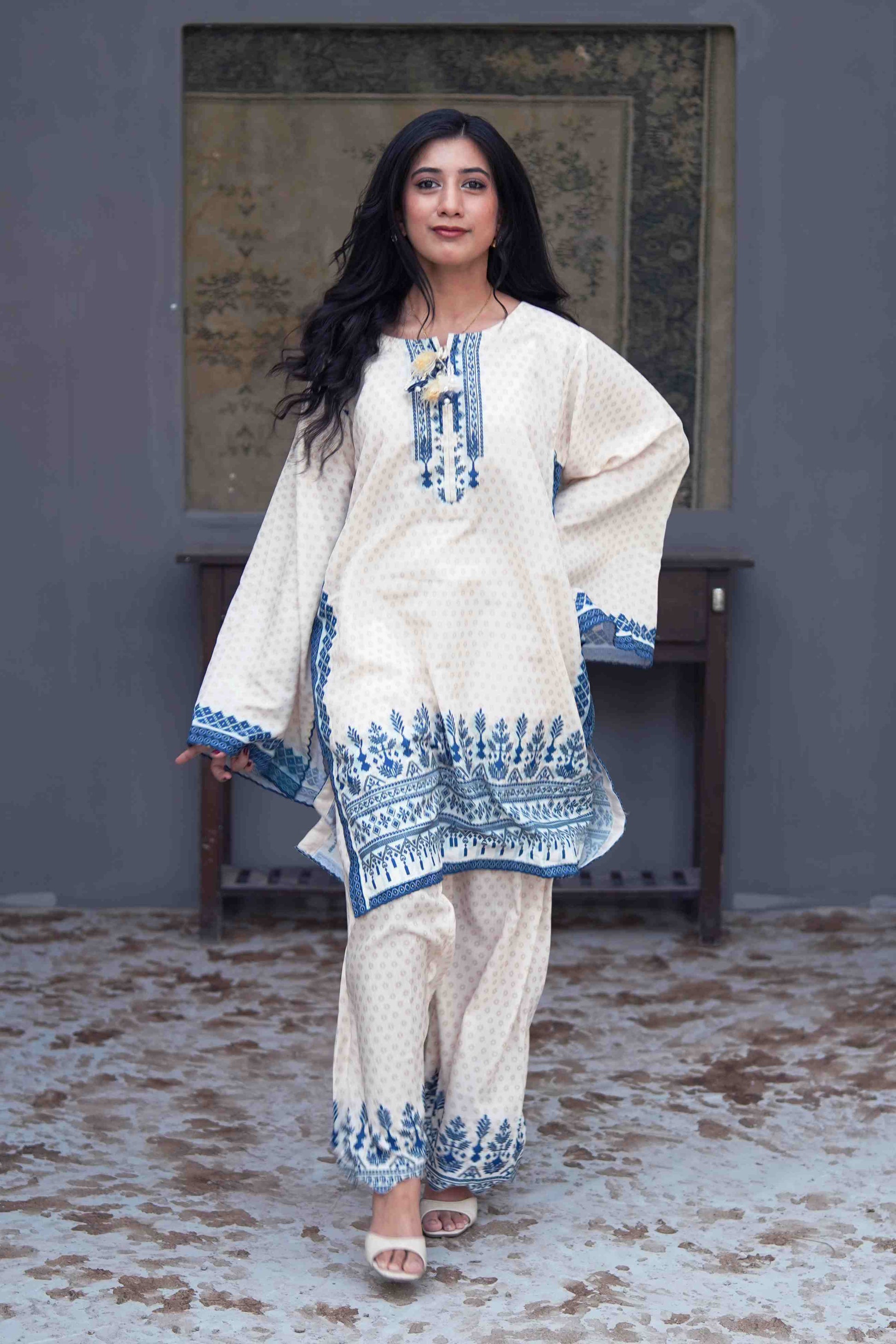 Add effortless charm to your wardrobe with this printed co-ord set crafted from soft Linéa Cambric. Featuring a floral, geometric pattern Styled with a Dori work, the set pairs a shirt with matching culottes. Perfect for casual outings, brunches, or everyday wear.