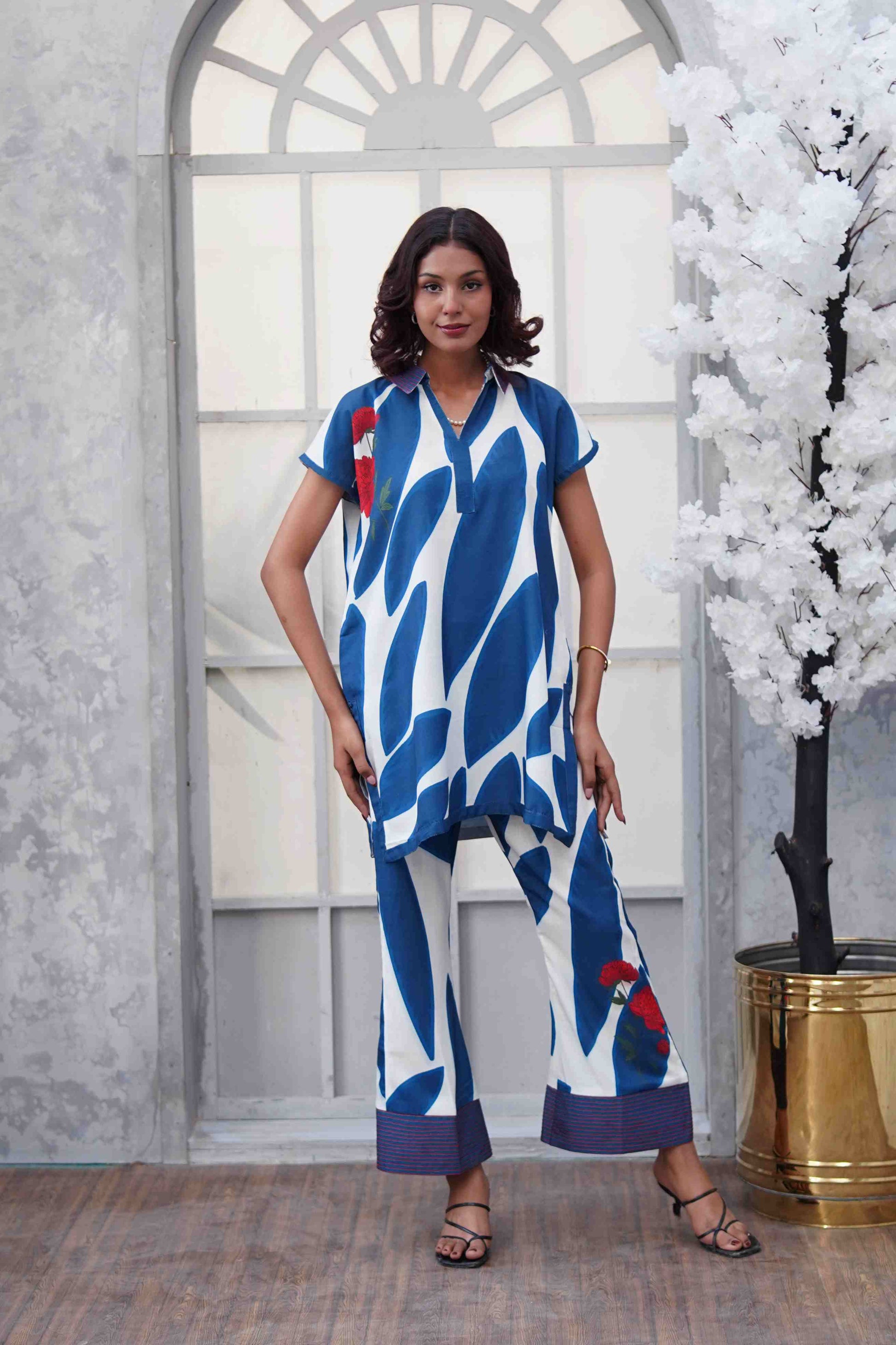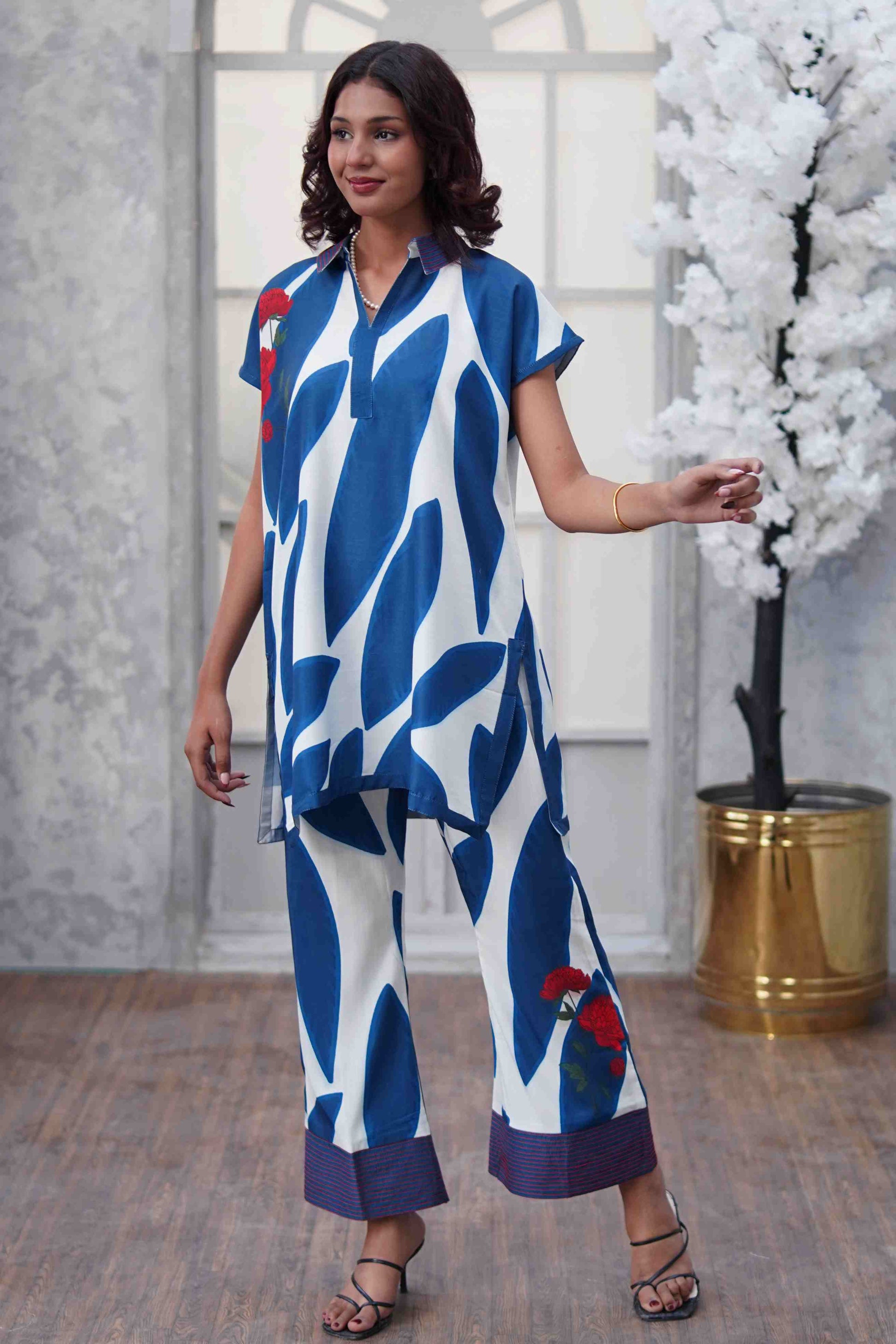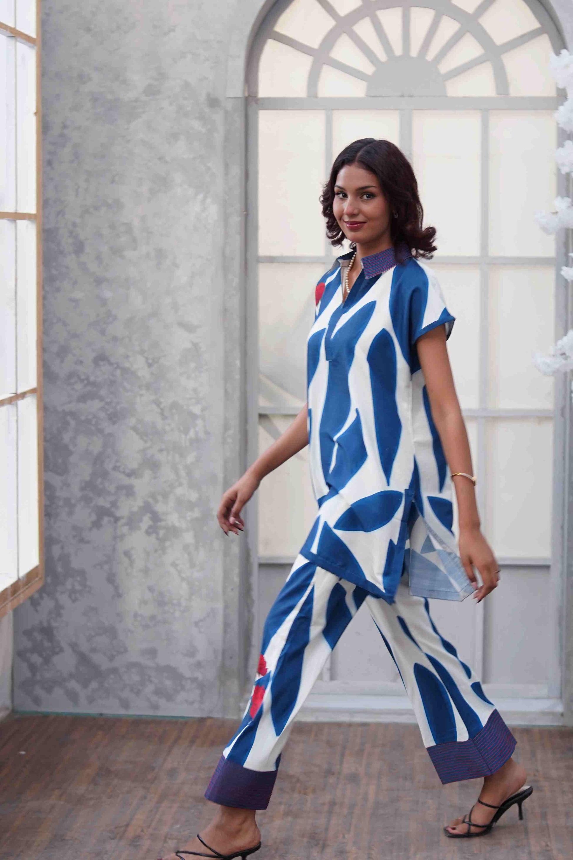 Add effortless charm to your wardrobe with this printed co-ord set crafted from soft Slub. Featuring a abstract pattern on white base, the set pairs a shirt with matching culottes. Perfect for casual outings, brunches, or everyday wear. Thread work on collar and bottoms.