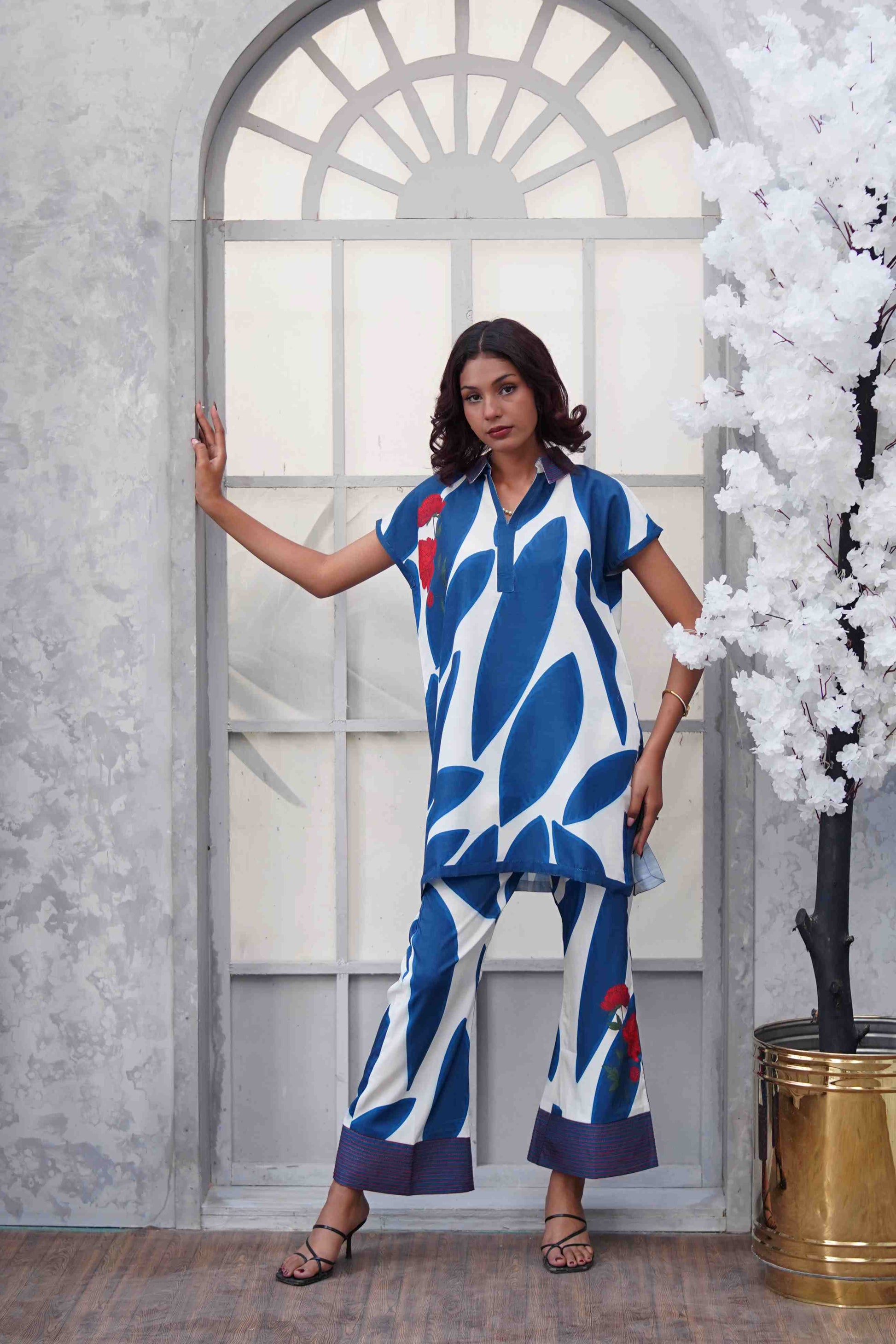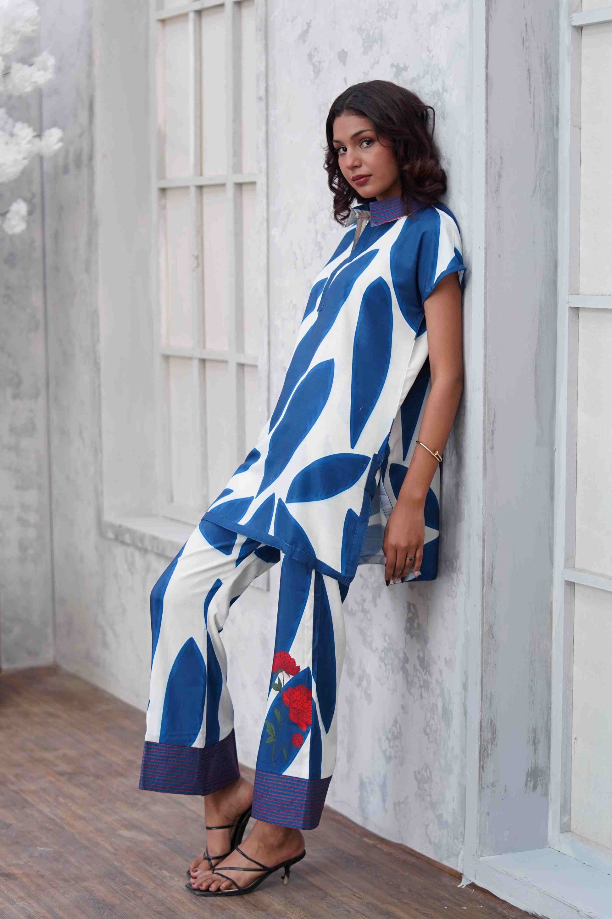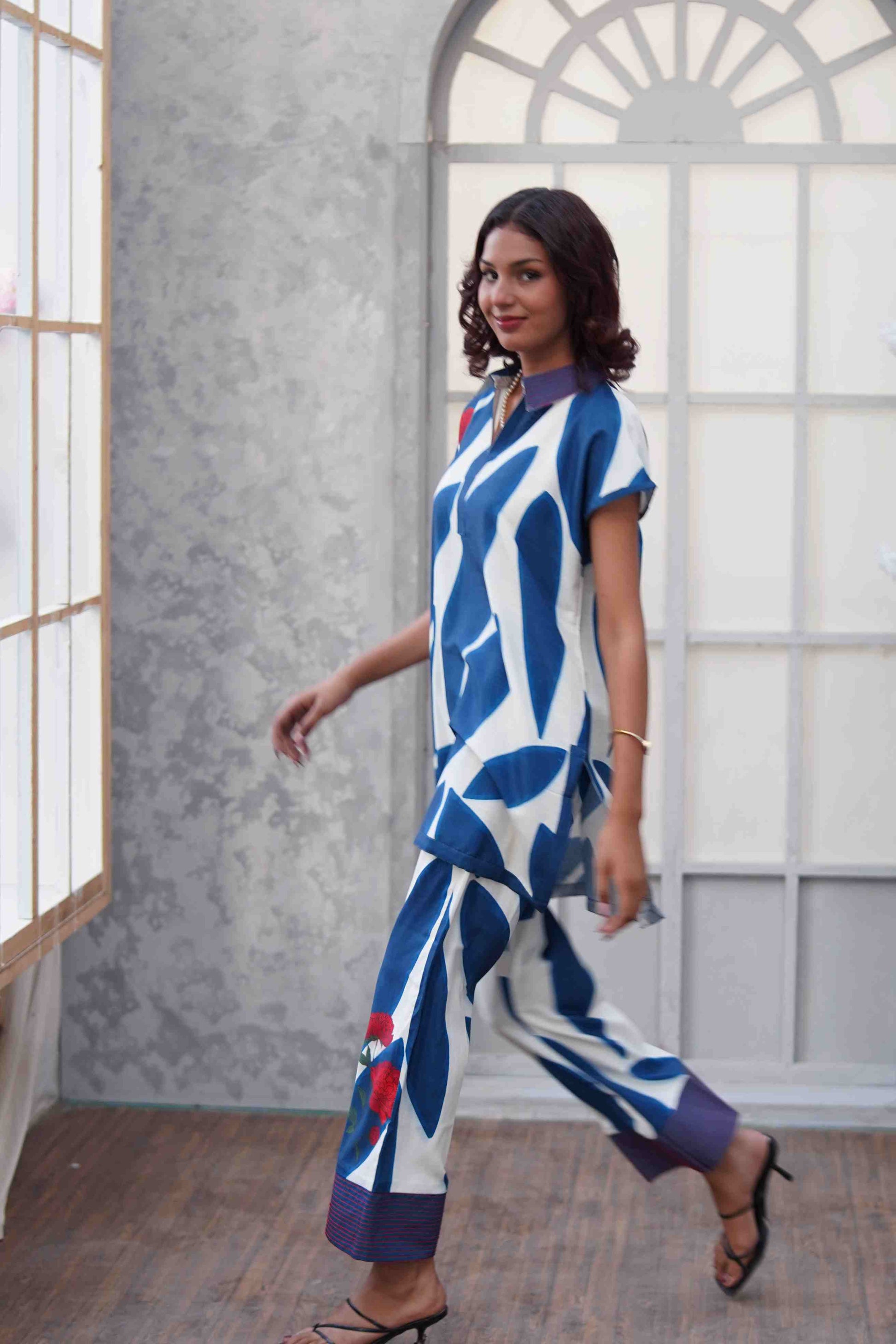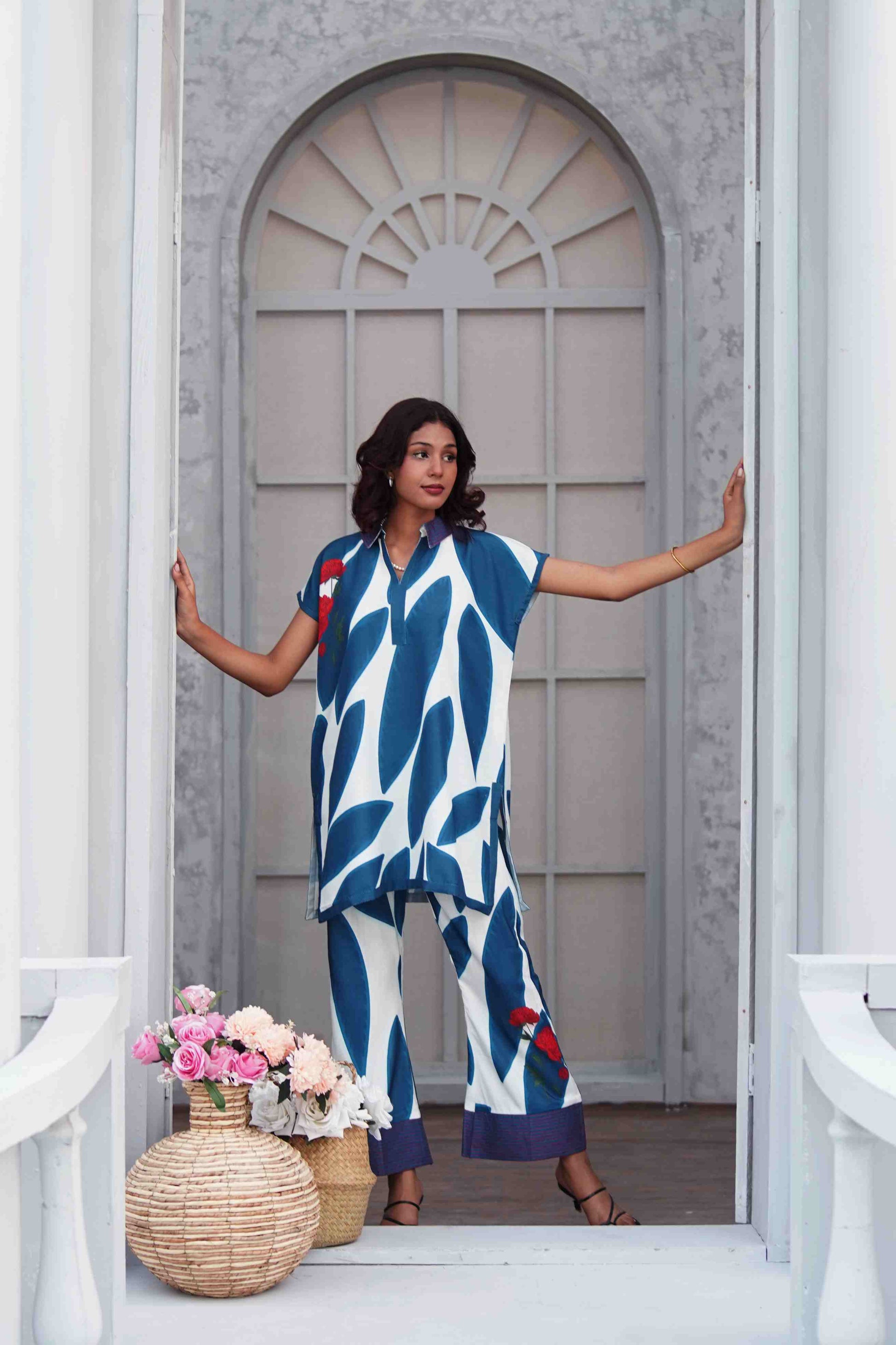Add effortless charm to your wardrobe with this printed co-ord set crafted from soft Slub. Featuring a abstract pattern on white base, the set pairs a shirt with matching culottes. Perfect for casual outings, brunches, or everyday wear. Thread work on collar and bottoms.